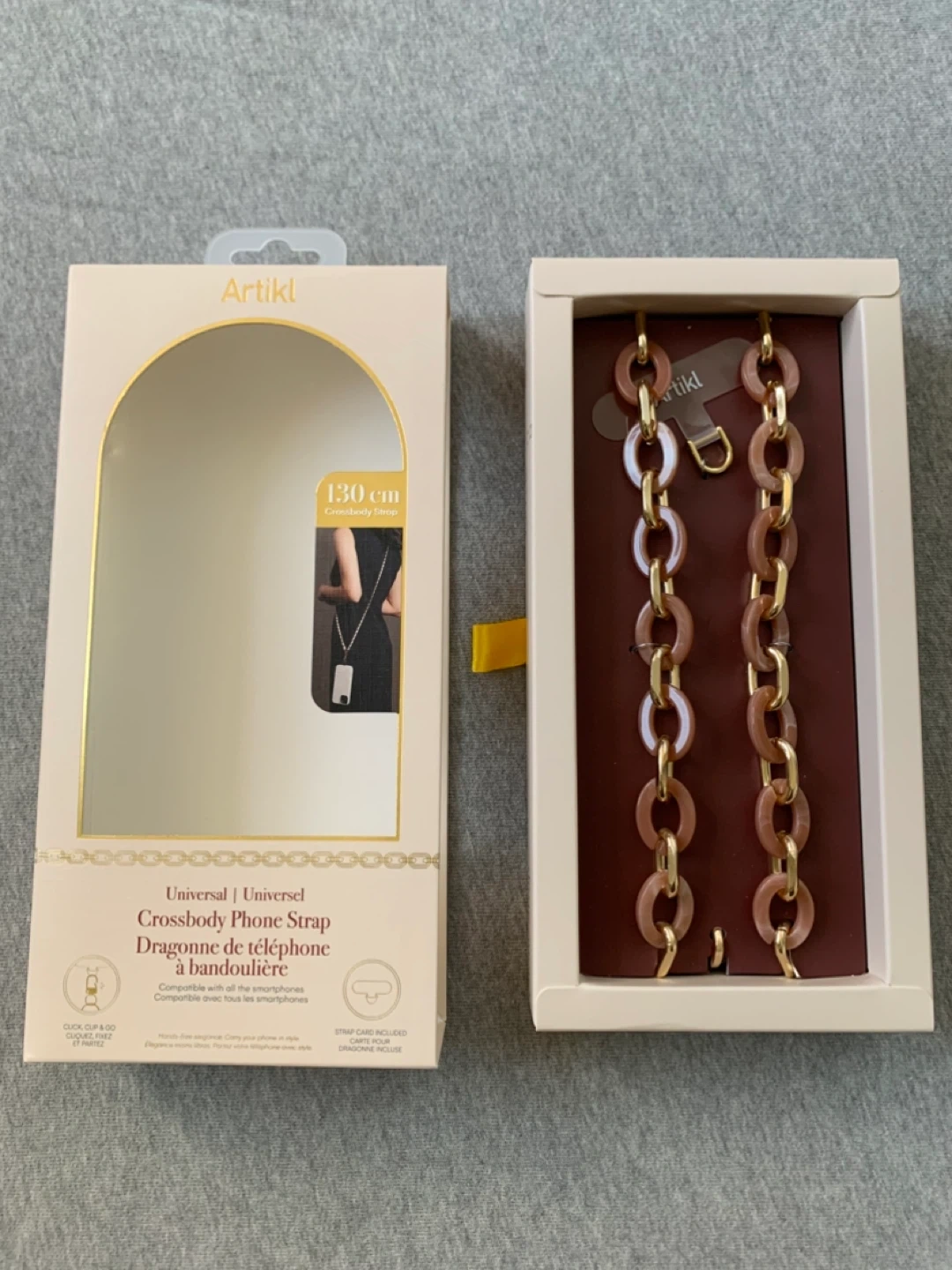 130 cm long and compatible with all smartphones. Fun large chain link type design in pinks and light brown. Perfect for keeping your phone handy and adding a touch of style!