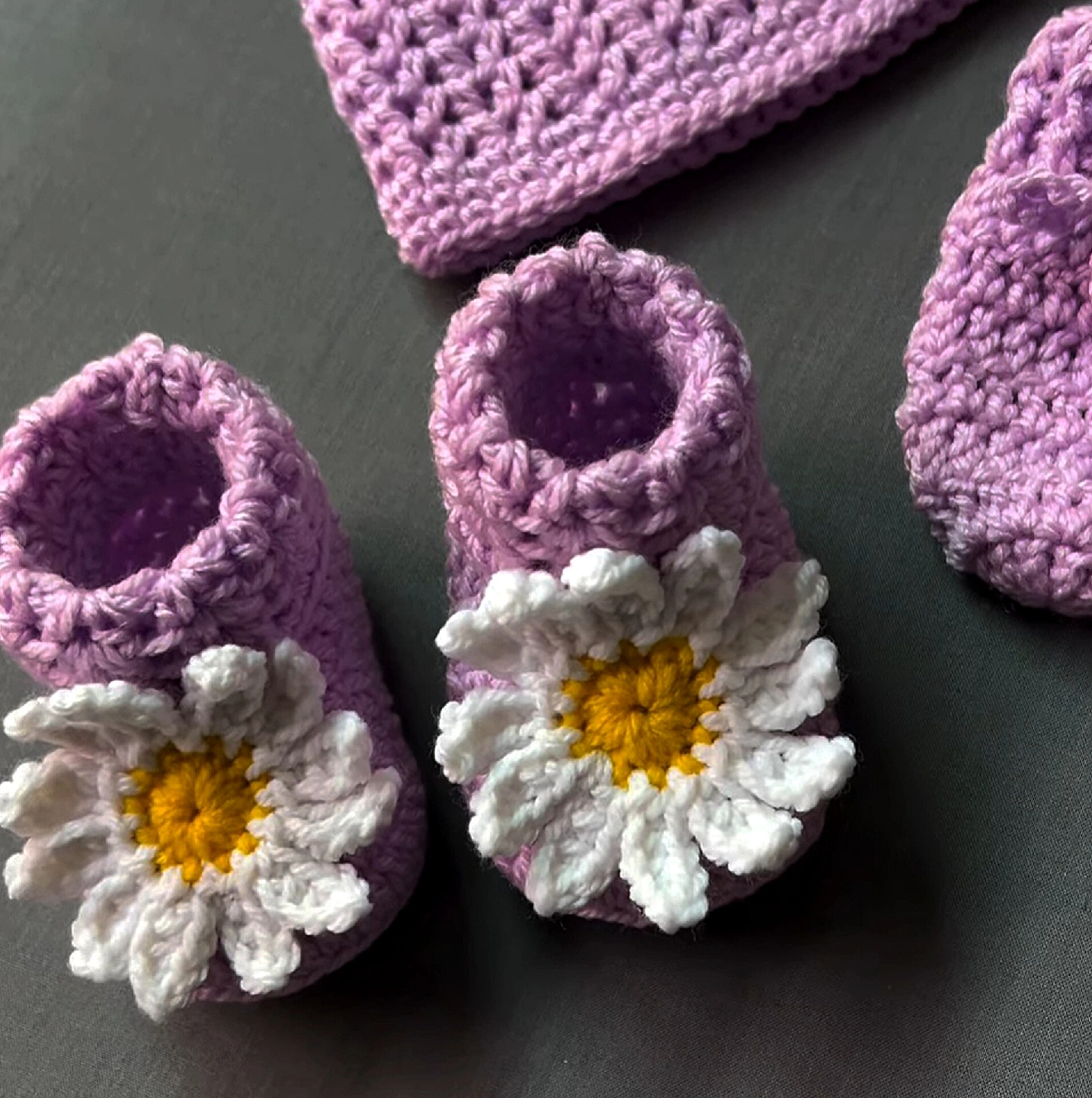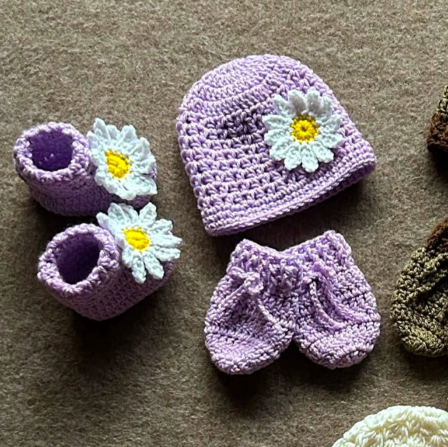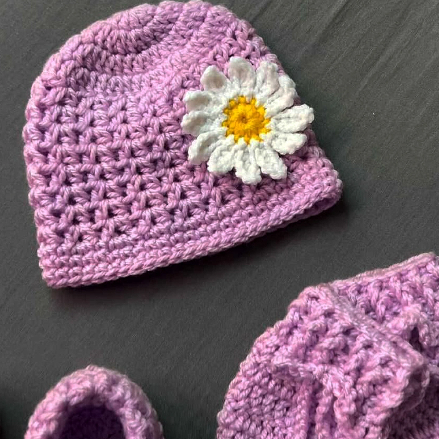 3 pc crochet gift set for baby girl. Perfect as a baby shower present. Includes cap, mittens and booties. Made from soft breathable acrylic yarn.