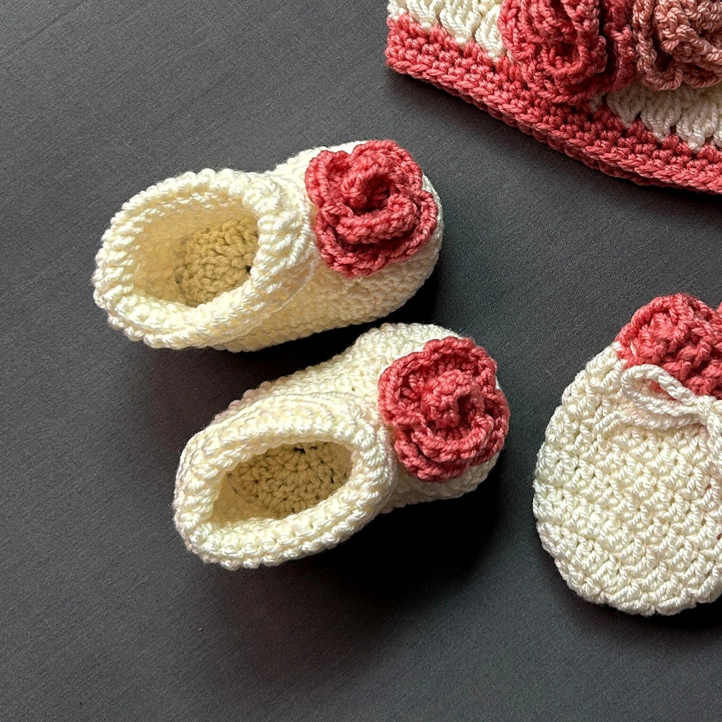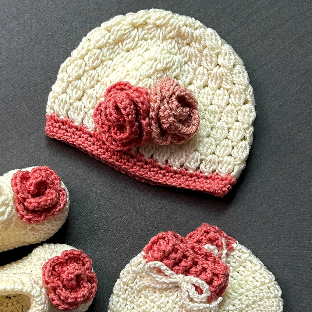 3 pc crochet gift set for baby girl. Perfect as a baby shower present. Includes cap, mittens and booties. Made from soft breathable acrylic yarn.