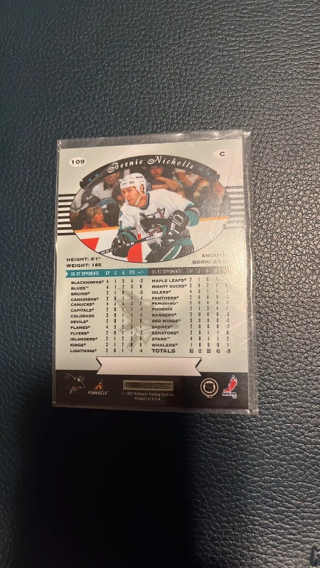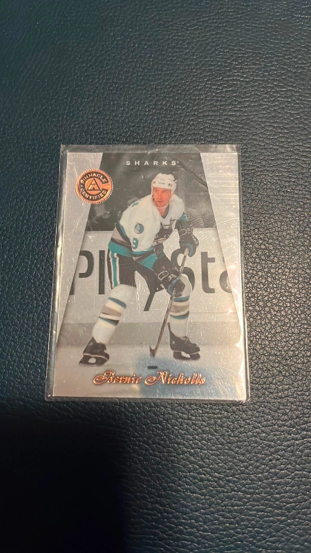Collectible hockey card. Bernie Nicholls Sharks. Pinnacle certified brand. #109. 1997. Seems to be in good condition, nice and shiny, stored in a plastic sleeve. $8. Near the Burlington/Oakville border.