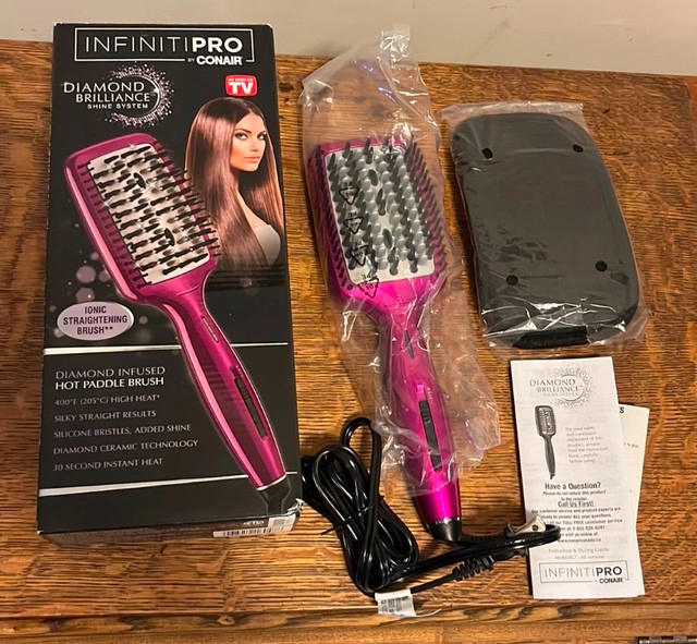 Conair InfinitiPro ionic straightening brush. Diamond Brilliance shine system. Hot paddle brush. Diamond-infused ceramic. 30-second instant heat. Used once but I can't be bothered styling my hair. Works fine. Heats quickly. With box, manual, and protective pad for your countertop. $35. Near the Burlington/Oakville border. No delivery.