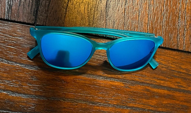 Reading sunglasses with hard case and cleaning cloth. UV/blue light blocking tinted lenses. Turquoise blue and sky blue mirror colors. Only worn a couple times. Cute prescription eyeglasses for reading poolside on vacation and more. $30. OD: plano -0.50 090 +1.25 OS: -0.25 -0.25 110 +1.25 Near the Burlington/Oakville border.