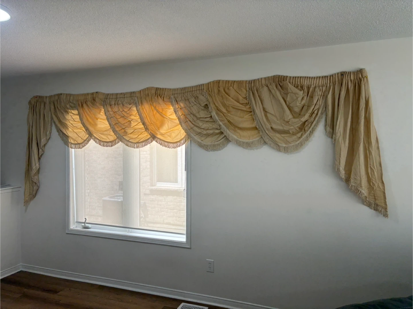 Selling a lovely beige window valance! It has a beautiful draped design and fringed trim, adding a touch of elegance to any room. Perfect for dressing up your windows!