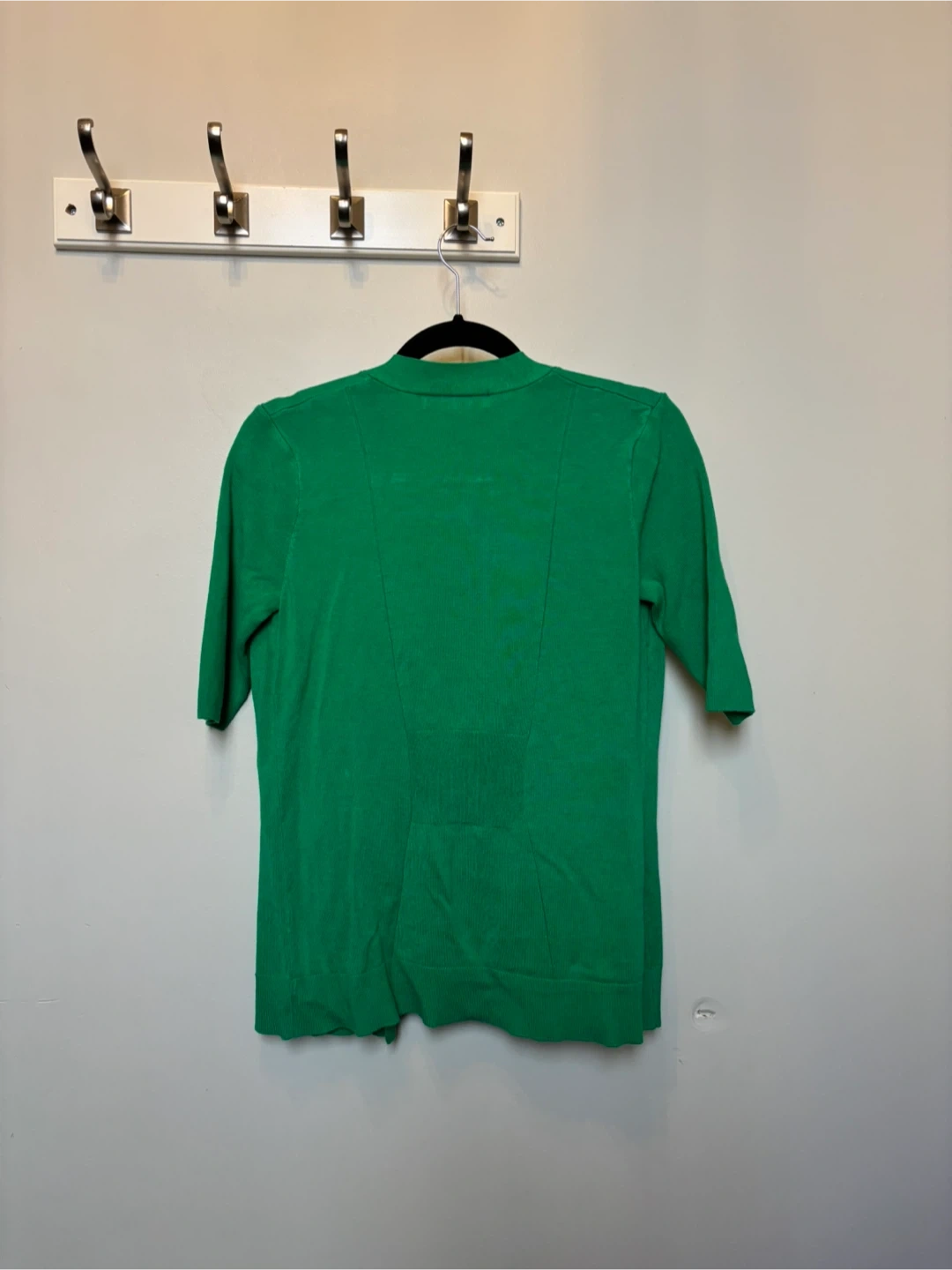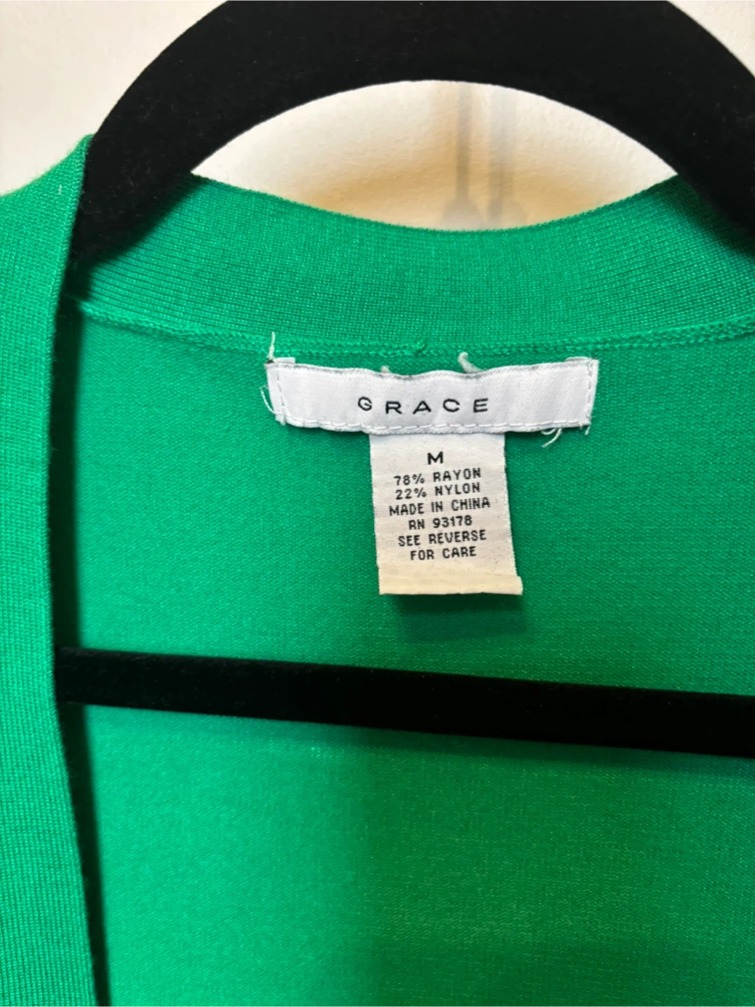 Here's a lovely green cardigan from Grace in a size medium! It's made of 78% rayon and 22% nylon, making it a comfy and breathable layering piece