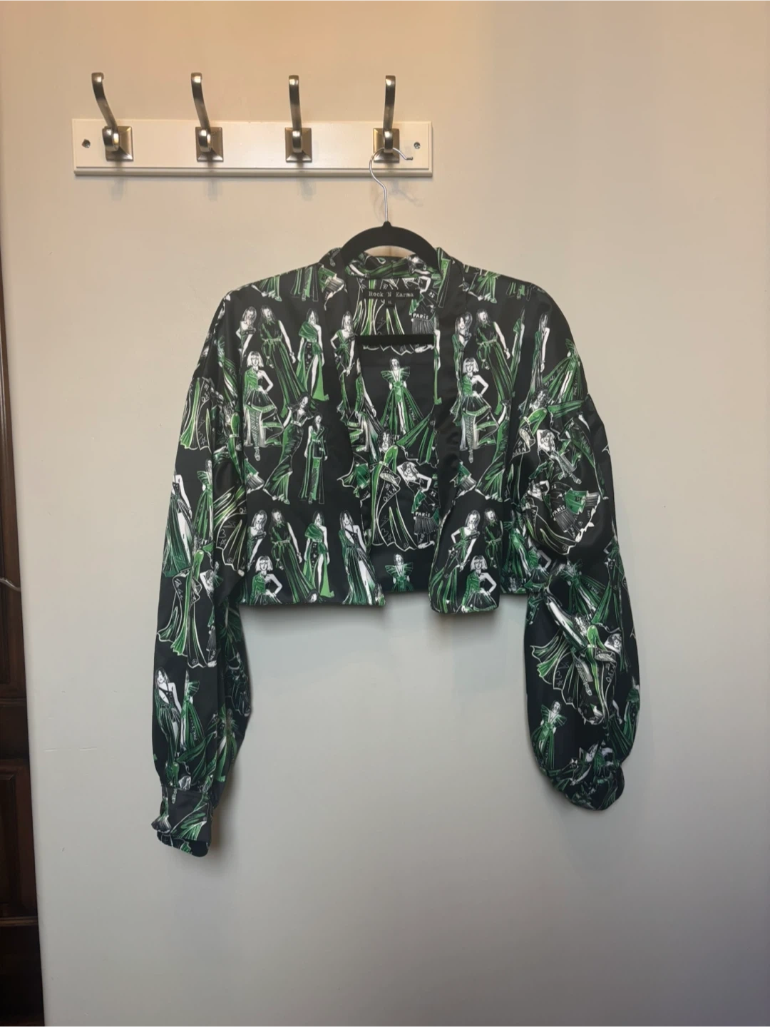 Rock N Karma bolero jacket in size XL. Features a unique green and white illustrated pattern on a black background. Perfect for layering or adding a statement piece to your outfit