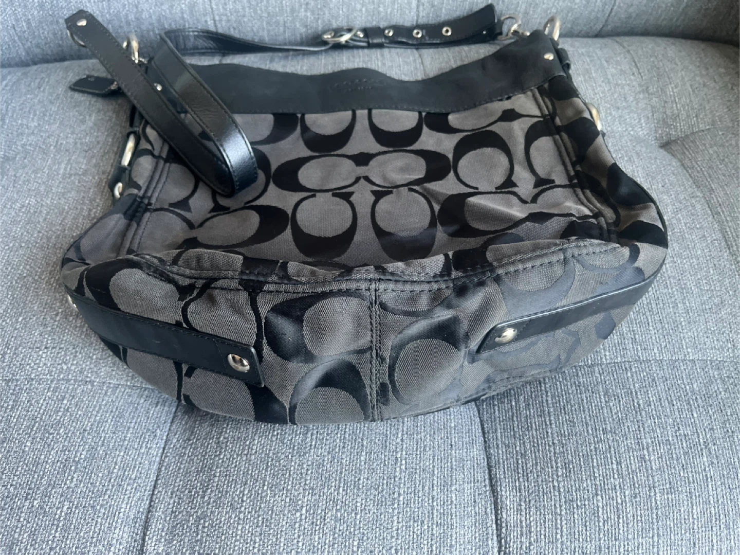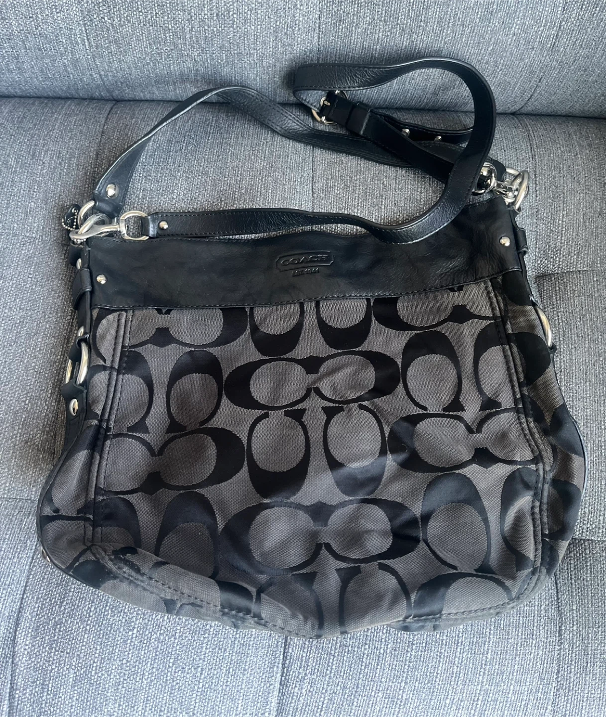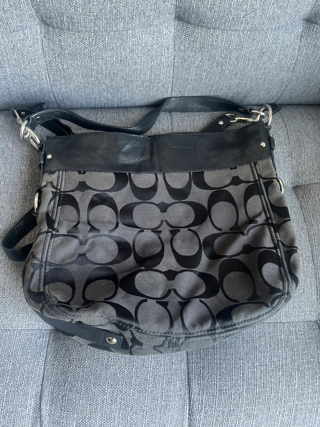 Selling a Coach hobo bag in black signature print. It's in great condition and has a classic look. Perfect for everyday use! Elegant Coach shoulder bag with a black leather trim and dark gray pattern. This elegant bag features the iconic Coach design, perfect for any occasion. Its sleek black color adds a touch of sophistication to your ensemble. Ideal for everyday use. A vintage piece In great pre loved condition! Pickup Brampton or downtown Toronto