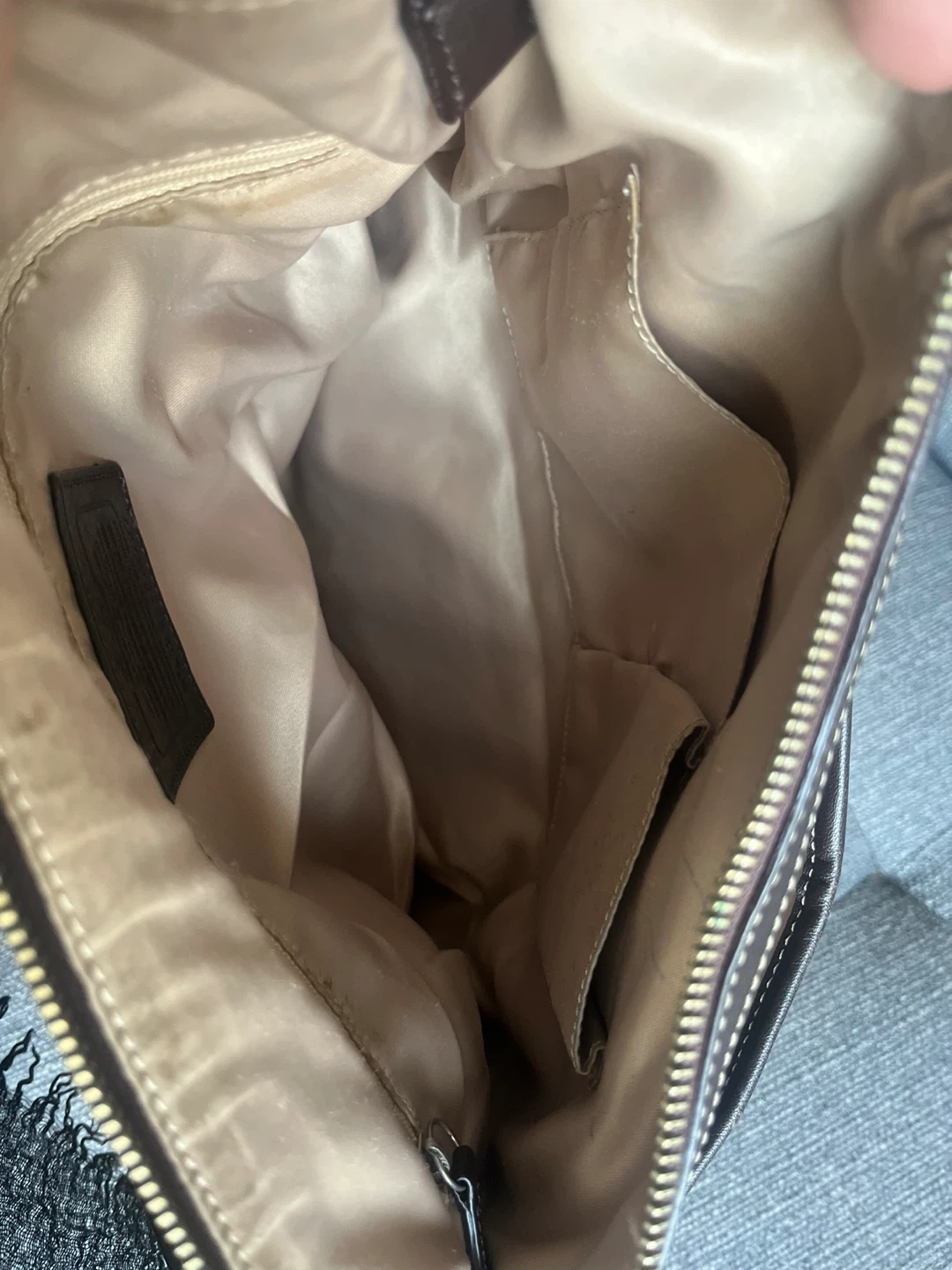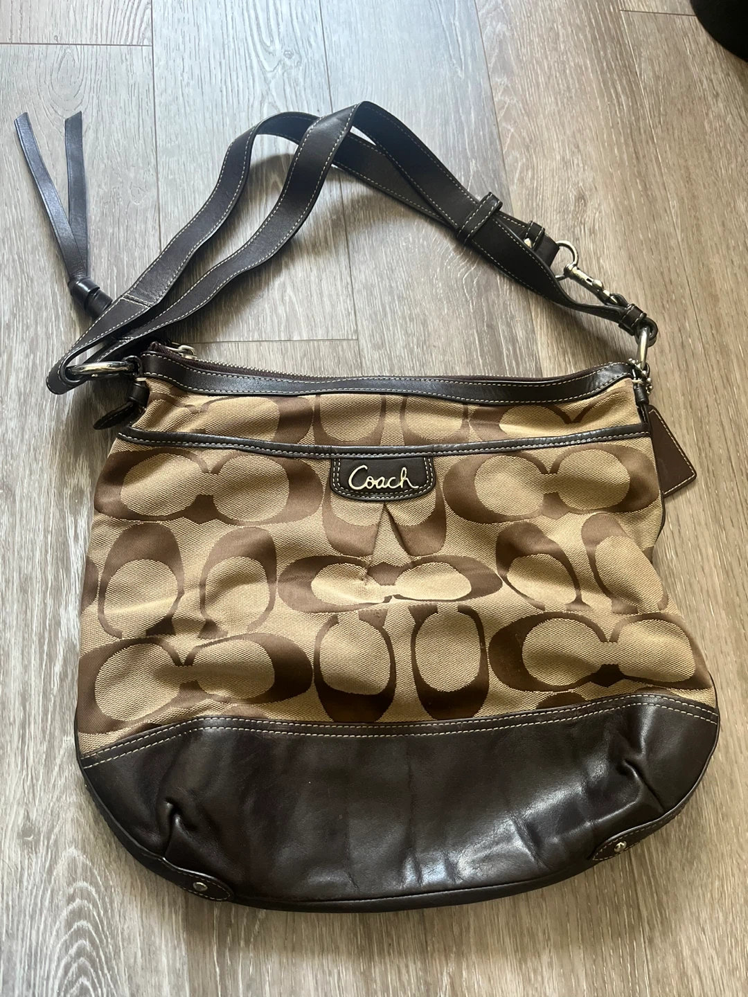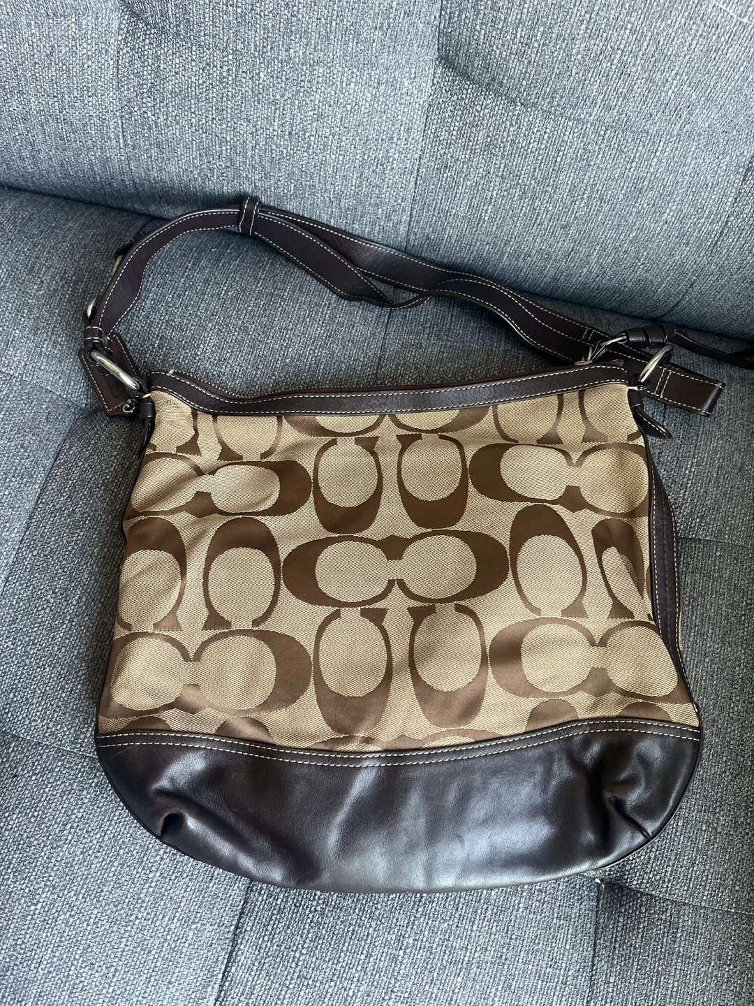 Selling a Coach shoulder bag with the signature "C" pattern in brown. It's in good condition and has a dark brown leather trim and straps. Perfect for everyday use! Stylish Coach shoulder bag with signature pattern. Features tan and brown tones. Perfect for everyday use. Vintage piece, In excellent pre loved condition Pickup Brampton or downtown Toronto