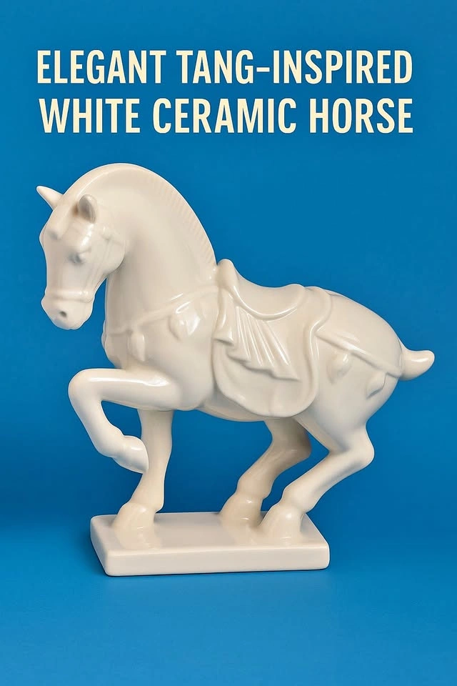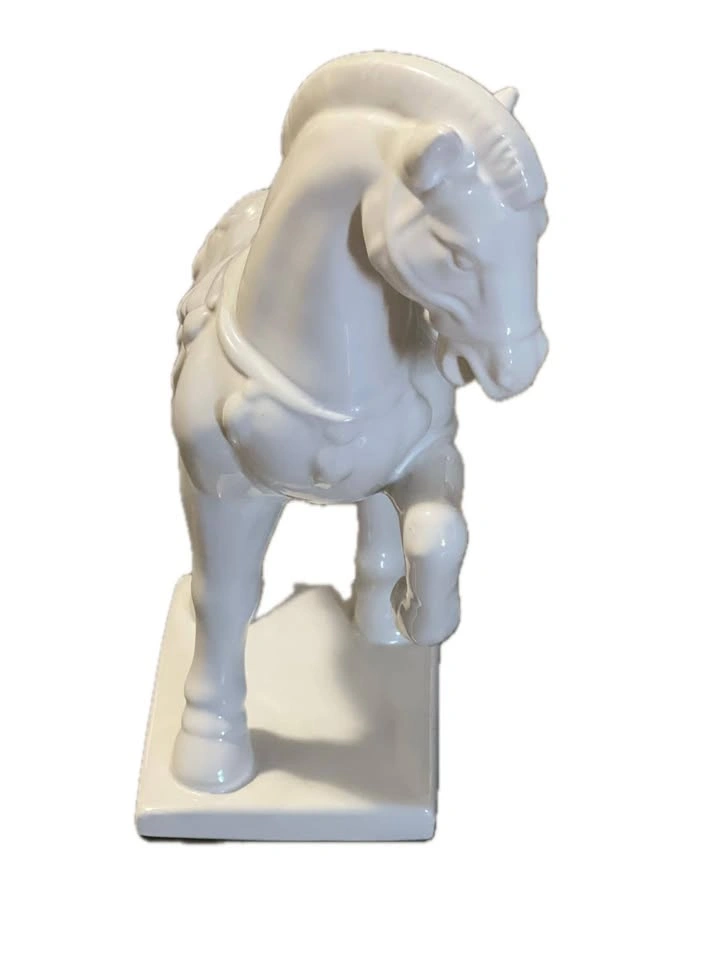 Beautiful white ceramic horse figurine, inspired by the elegance of Tang Dynasty art. This piece features intricate detailing with a sculpted saddle, flowing mane, and a prancing stance — a true statement décor accent. Its glossy white finish makes it versatile, blending seamlessly with modern, classic, or minimalist interiors. Perfect for display on a console, bookshelf, or side table. In excellent condition with no chips or cracks. Measures approx. 25cm heigh ✨ Tang-inspired design ✨ Glossy ceramic finish ✨ Elegant statement piece Asking for $35 OBO Pickup: Oakville, ON