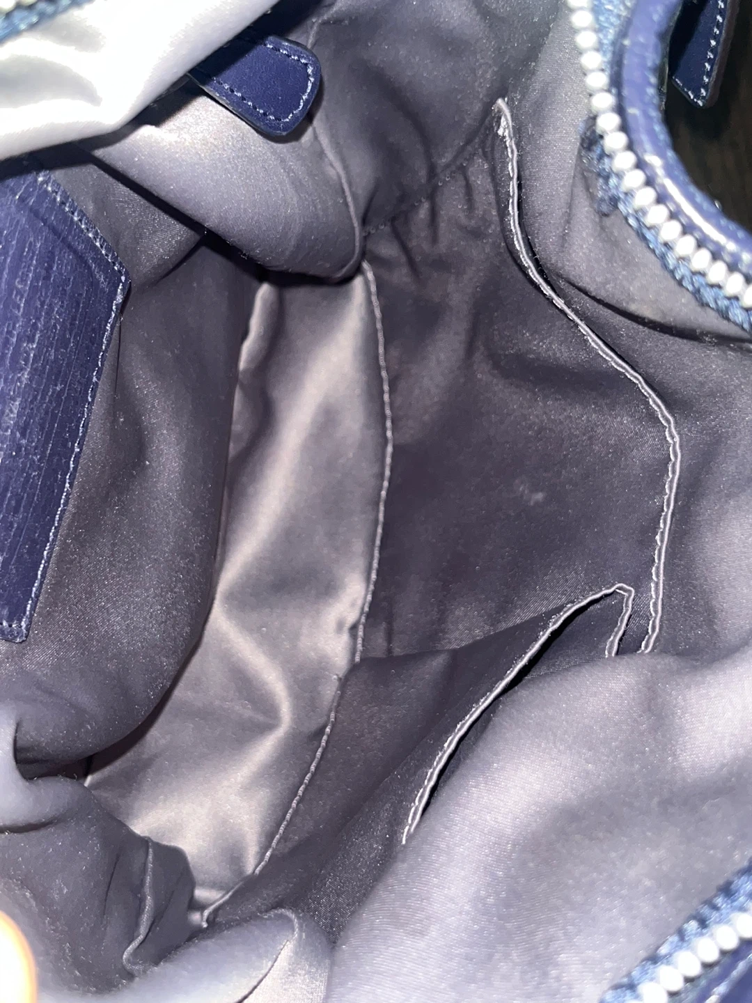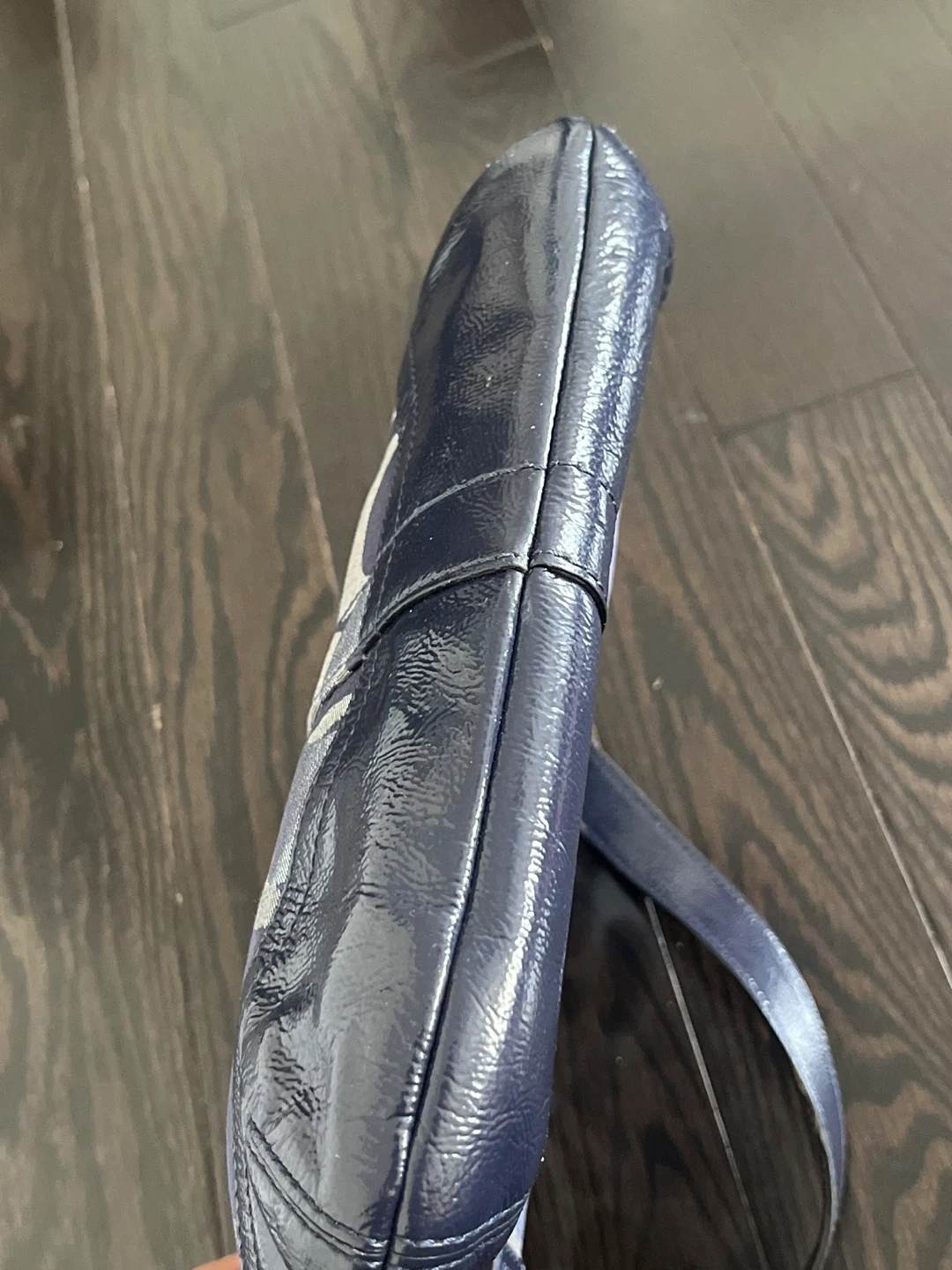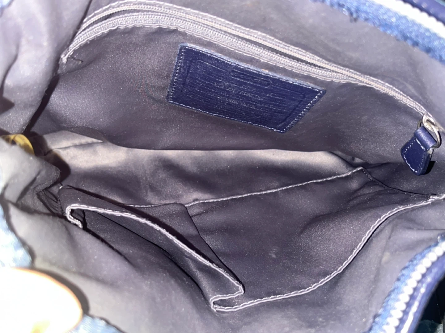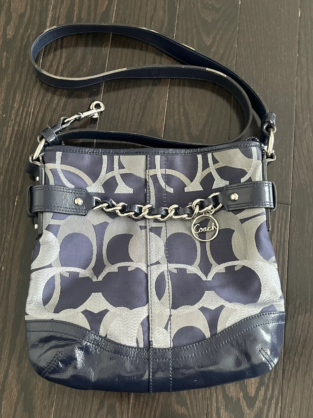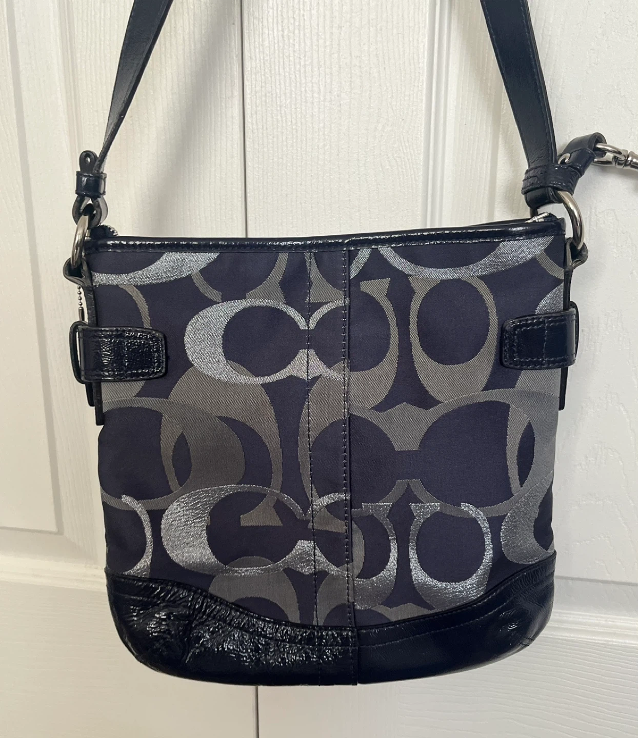 Elevate your style with this vintage Coach navy blue shoulder bag with grey and silver accents. Perfect for any occasion, this bag combines elegance with functionality. Good preloved condition. Bag is pristine, only some wear on the shoulder straps Check all pictures for details!