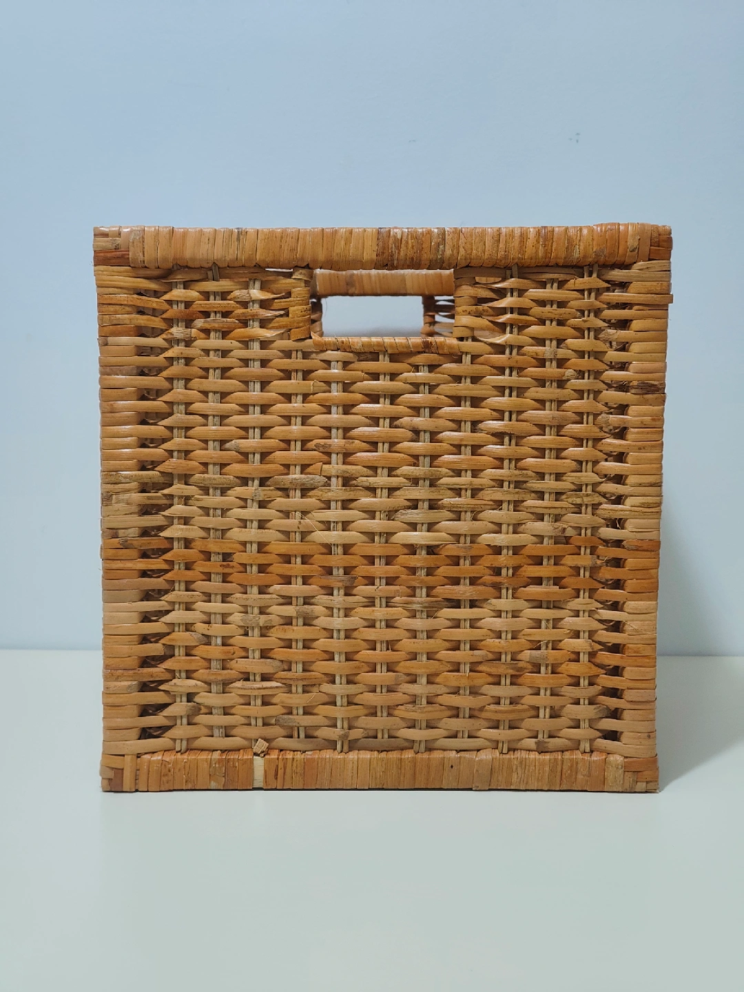 Here's a wicker storage cube. It's perfect for organizing your space and adding a touch of natural texture to your home. It is in great condition and ready for a new home!