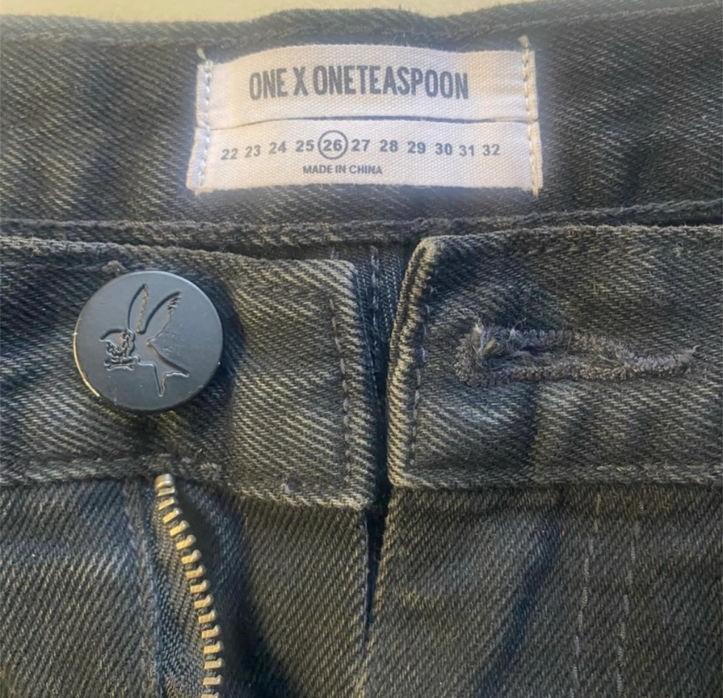 One Teaspoon black jeans in size 26! These jeans are made of 100% cotton and feature a unique design with metal eyelets down the sides. Maybe run ribbon through it? It’s a stylish and edgy addition to your wardrobe!