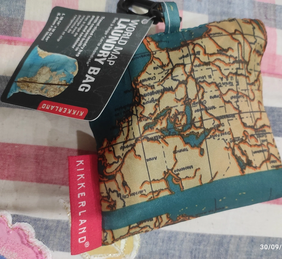 Brand new Kikkerland World Map Laundry Bag! This travel-sized laundry bag has a compact built-in pouch and carabiner for easy carrying. The dimensions are approximately 16.34" x 22.04" (41cm x 56cm)