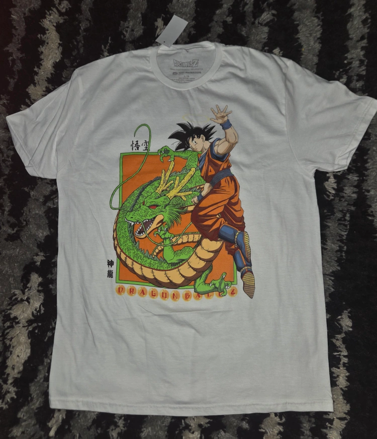 Selling a Dragon Ball Z t-shirt in size L. The shirt is white and features a graphic of Goku and Shenron. Perfect for any Dragon Ball fan!