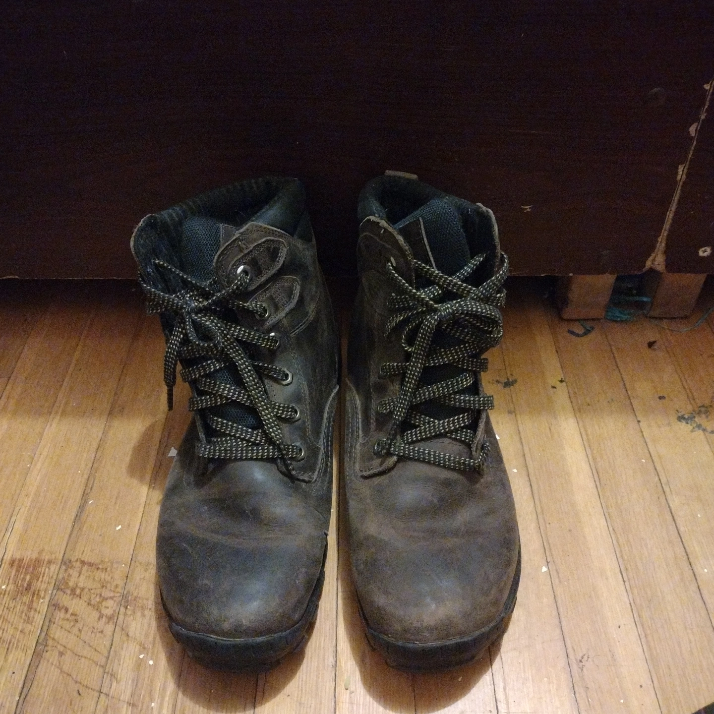 Sturdy cool brown boots, made by Timberland; They have, climate fabric so you don't get too hot or cold, waterproof material on the boots, and, nice long strong laces. Worn a few times while working in the yard and such, and feels really comfortable size 9.5