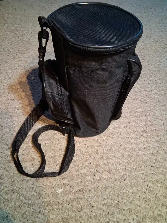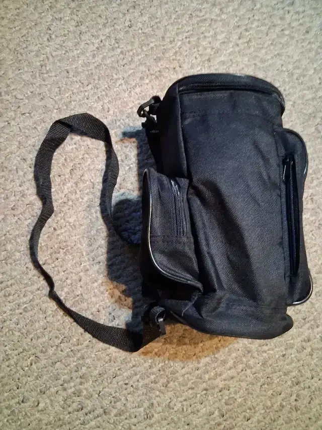 This is a compact, water-resistant bag perfect for carrying your water bottle and essential gear. The bag features a zippered main compartment, additional pockets for accessories, and a convenient shoulder strap for easy transport.