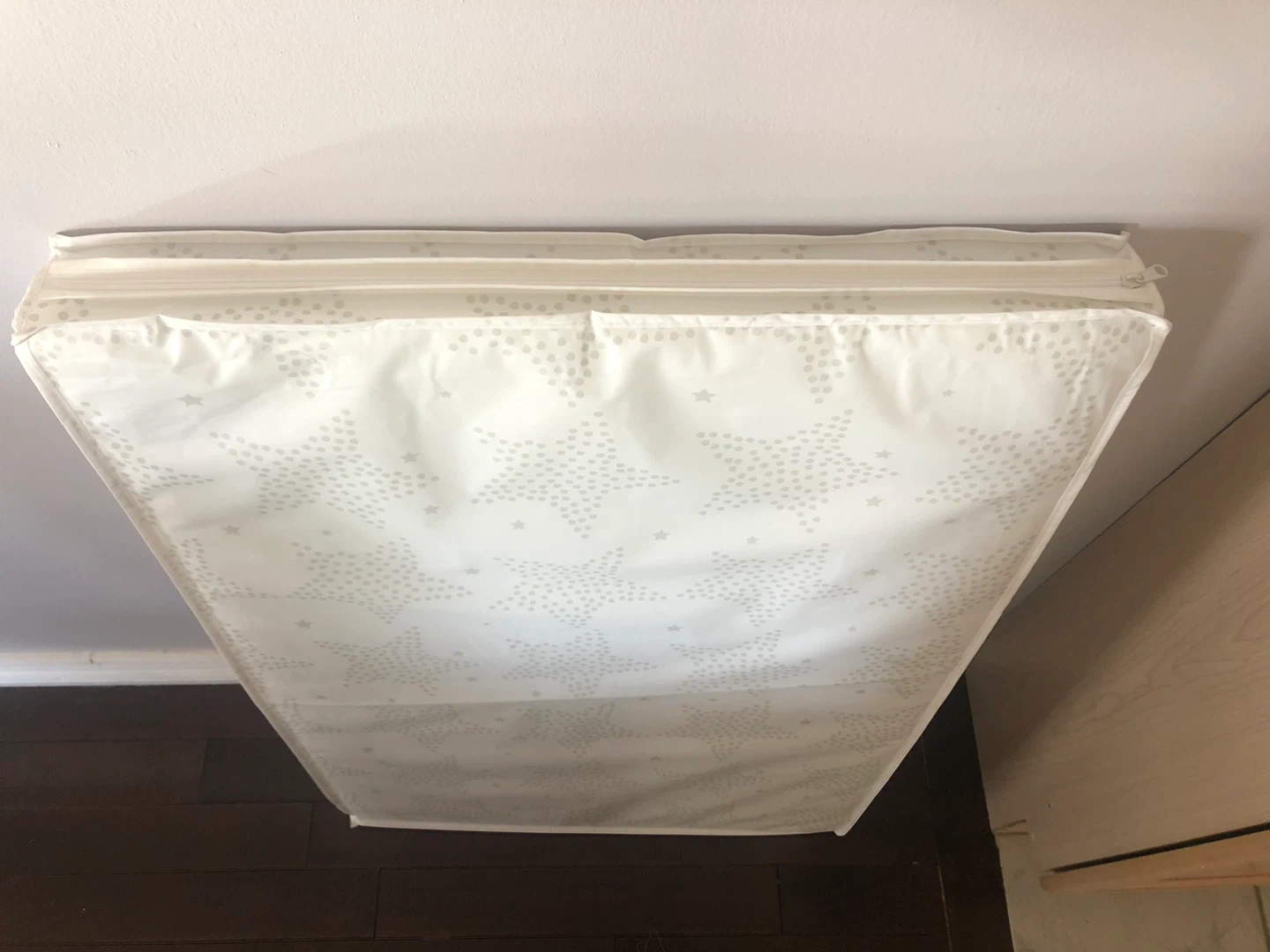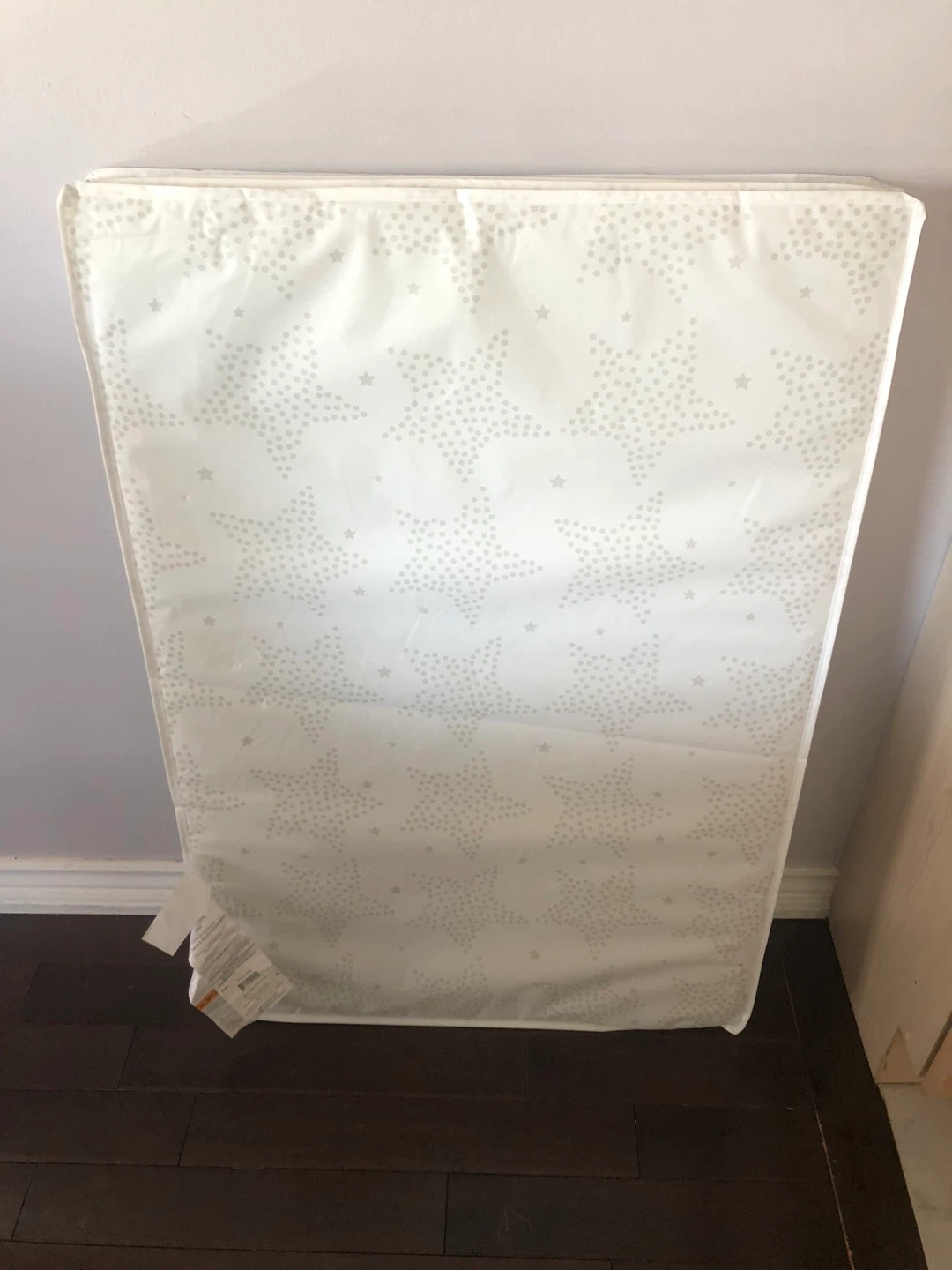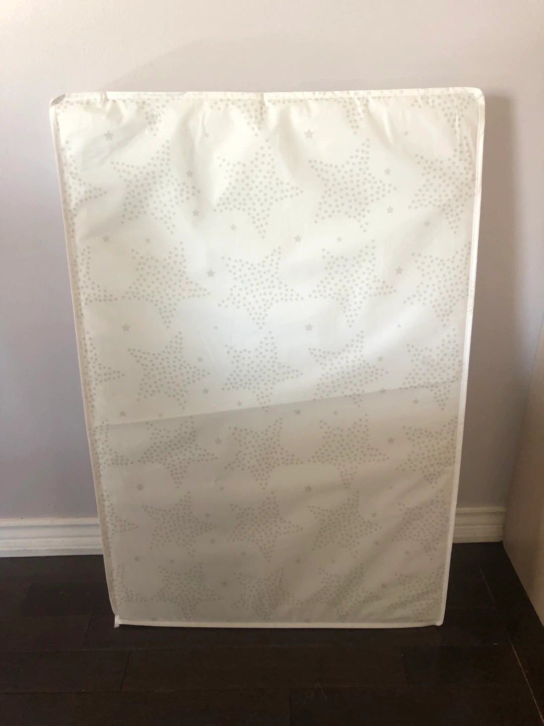 Selling a baby crib mattress. It's white with a star pattern. The mattress is in great condition and comes with a cover