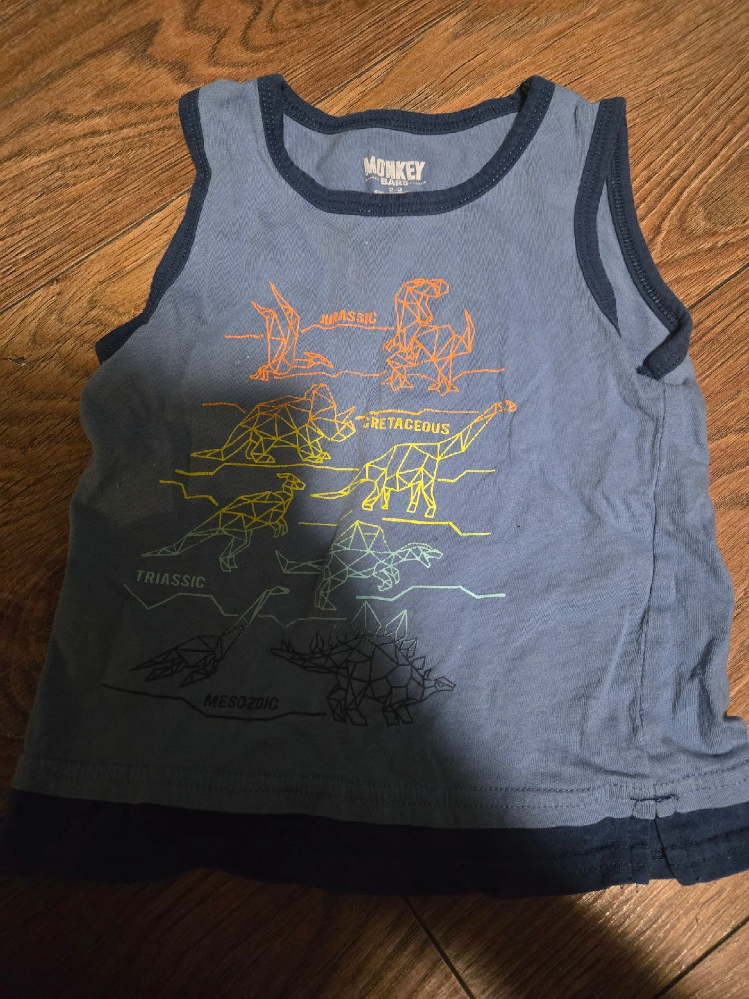 A cute Monkey Bars tank top for your little dinosaur enthusiast! The shirt features different dinosaurs from the Jurassic, Cretaceous, Triassic, and Mesozoic periods. Size 2-3.