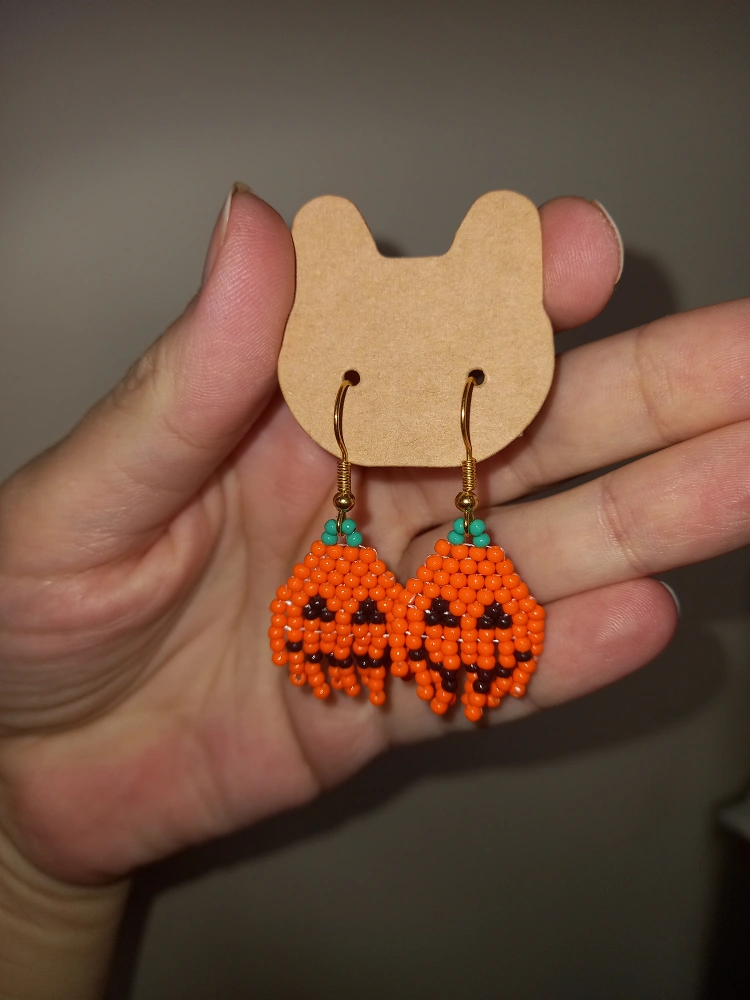 These are super cute pumpkin earrings, perfect for Halloween! They're handmade with tiny orange and orange beads. The earring hooks are gold coloured.