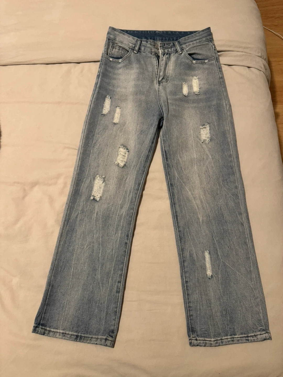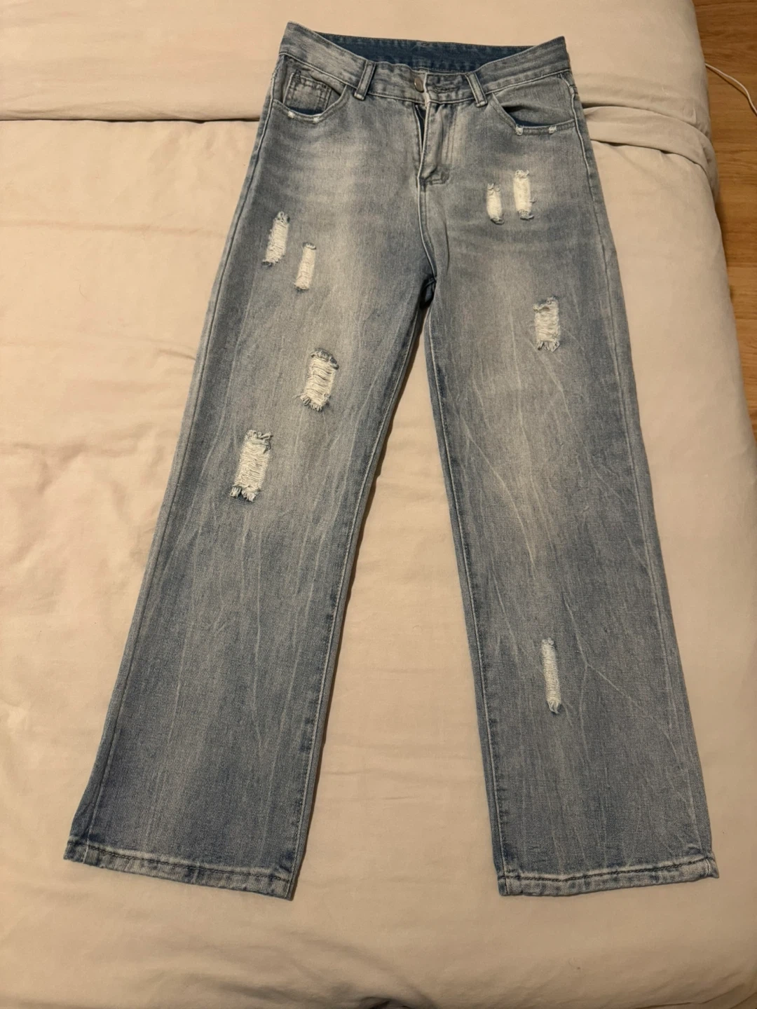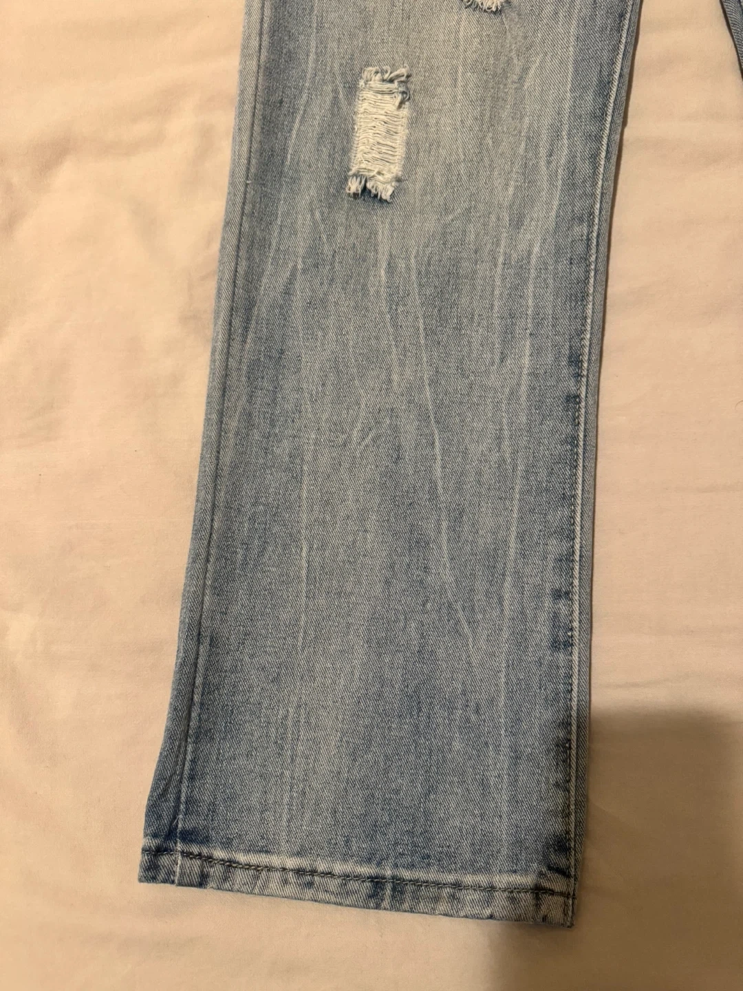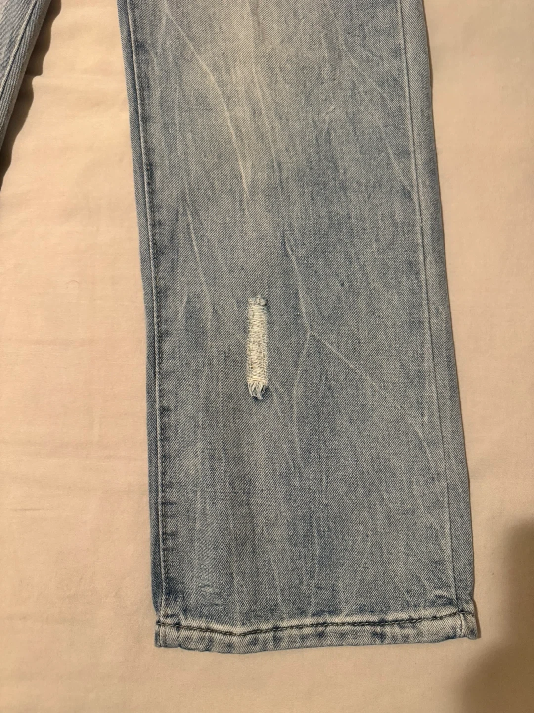 Selling a pair of light wash denim jeans with a distressed look! They have a relaxed fit and are perfect for a casual, everyday style. Check out the photos for the distressed detailing