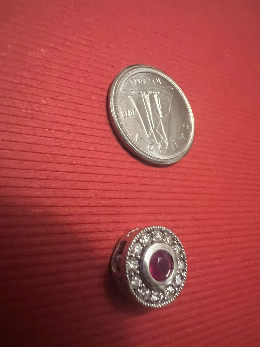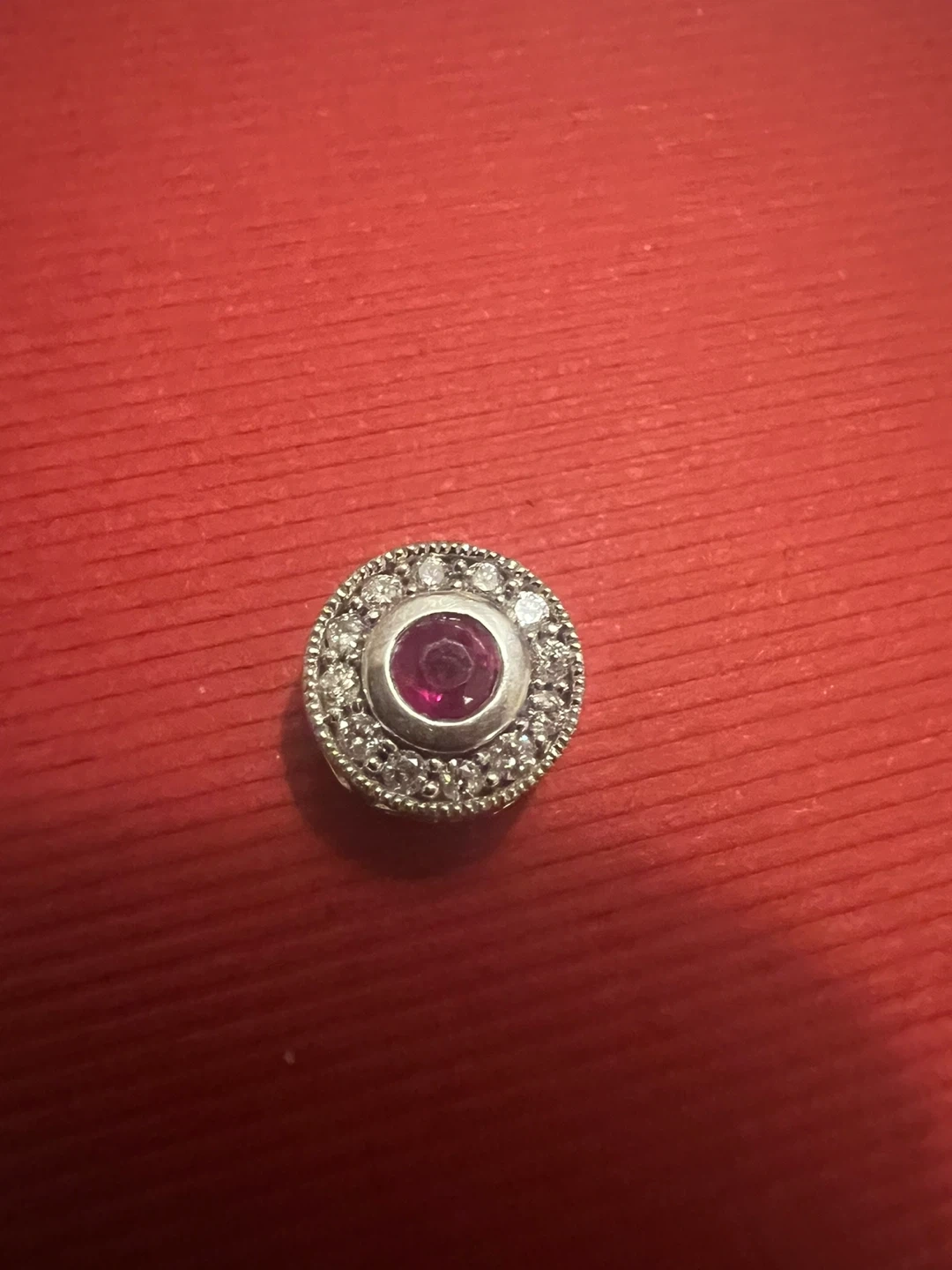 Selling a beautiful 10K gold charm featuring a ruby centre stone surrounded by diamond accents. It's in great condition and would make a lovely addition to any charm bracelet or necklace!