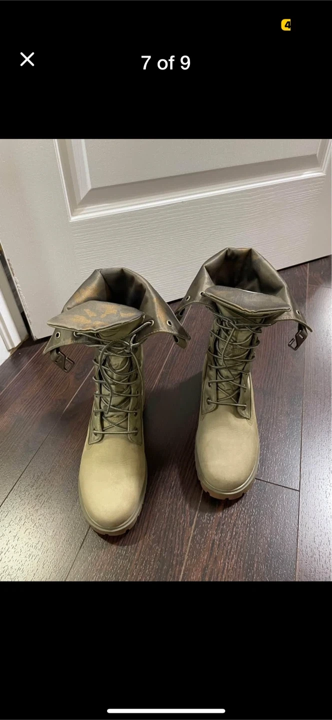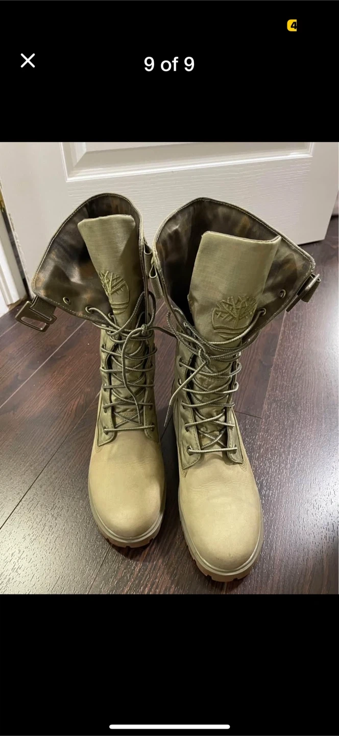 Timberland limited edition boots 🥾 size 7 women’s or unisex green leather. They can be rolled down to show off the feature of camouflage interior. Boots are about 12” high. Elevate your shoe game with these stylish and versatile Timberland Jayne boots. Perfect for any occasion, these boots feature a solid pattern, round toe, lace-up closure, and a standard shoe width. The green nubuck upper material is accented with a logo, making these boots both fashionable and functional. Ideal for winter, fall, and spring, these combat-style boots are waterproof and designed with a buckle for added support. They are perfect for travel, activewear, casual outings, and workwear. Add these Timberland Jayne boots to your wardrobe for a chic and comfortable look. Pickup in Brampton📍 Please checkout my other listings ℹ thanks 😊