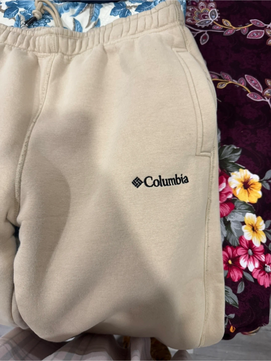 Show allCozy Columbia sweatpants in a lovely beige colour! Perfect for lounging or running errands. They feature a comfortable fit and the classic Columbia logo. Size: L