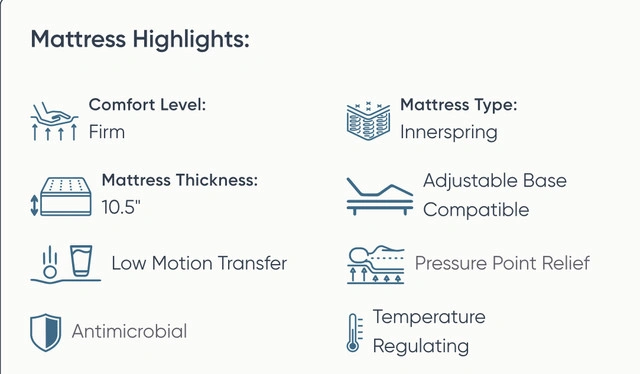 Queen: 80"L x 60"W x 10.5"H Mattress Composition Type Innerspring Mattress Pillow Top Style Tight Top Firmness Firm Temperature Regulating Yes Motion Control Yes Pressure Point Relief Yes Antimicrobial Yes Condition: Used - Like new For Sale By: Owner Cash accepted: Yes