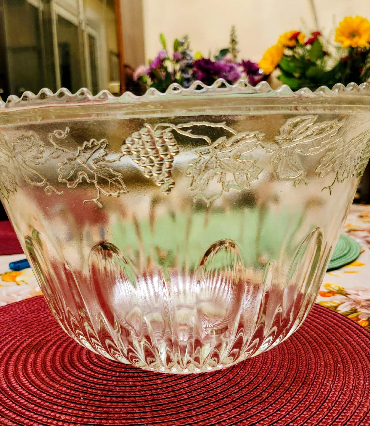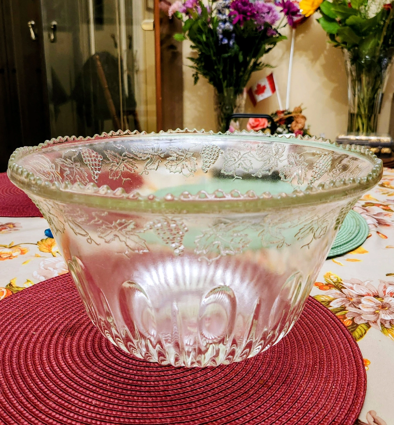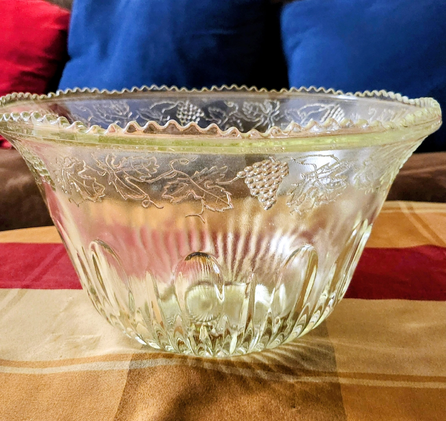 Selling a lovely vintage clear glass punch bowl! It features a beautiful grape design around the bowl and a decorative scalloped edge. Perfect for parties or adding a touch of vintage charm to your home.