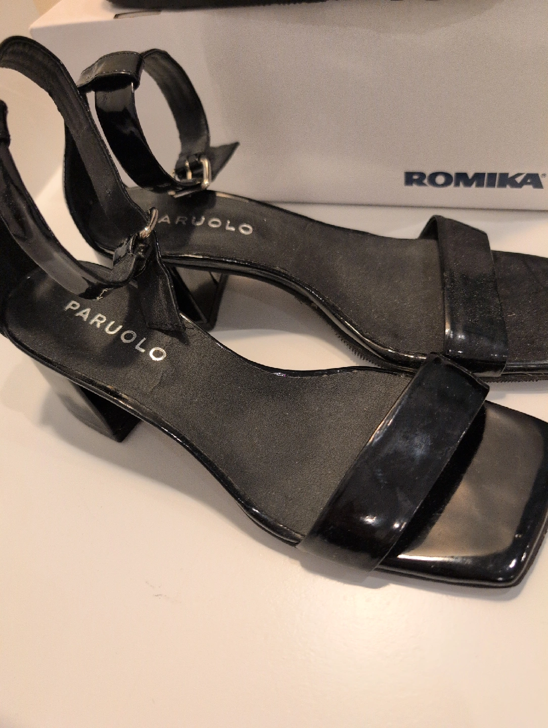 These Paruolo sandals are in great shape and ready for a new home! They feature a sleek black patent leather finish, perfect for dressing up or down. The block heel provides a comfortable lift, and the ankle strap ensures a secure fit. A stylish addition to any wardrobe!I purchased these in Argentina and were them just once for a wedding. very stylish!