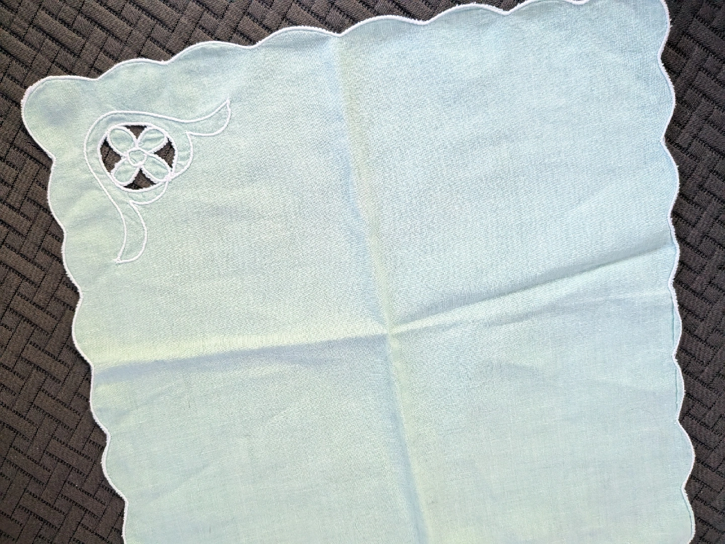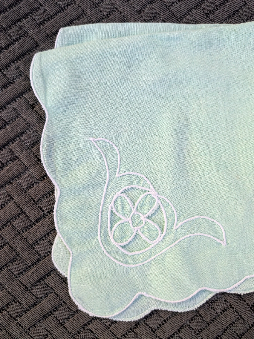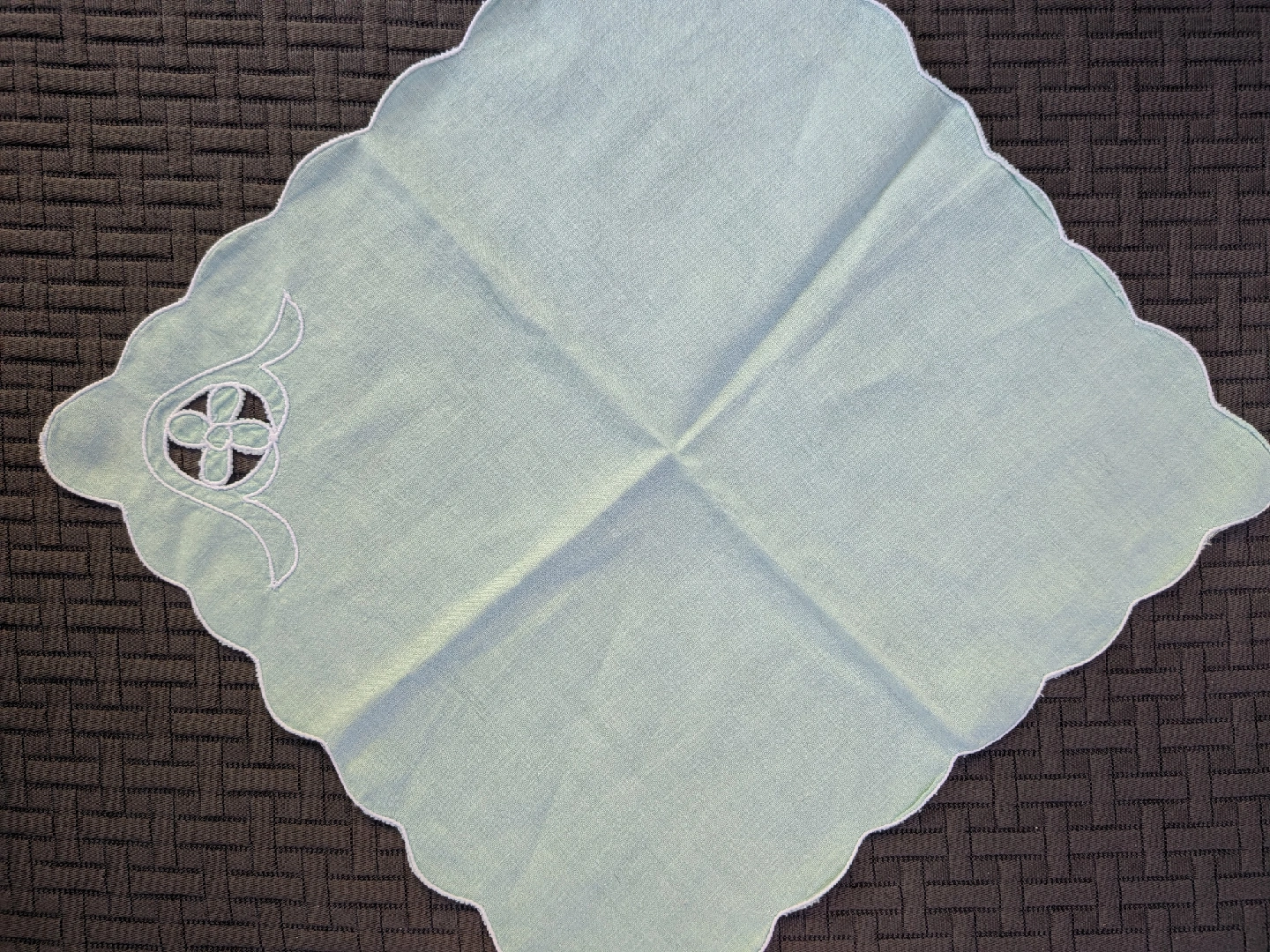 Here's a sweet vintage light blue handkerchief with delicate embroidery. It has a scalloped edge and is in great shape. Perfect for adding a touch of charm to your everyday carry or for a special occasion From the 50's era Not new, but good condition despite its age, with no stains, tears, etc Cash only, no etransfers Location: Etobicoke. Rathburn Rd and Renforth dr. Etobicoke Olympium nearby
