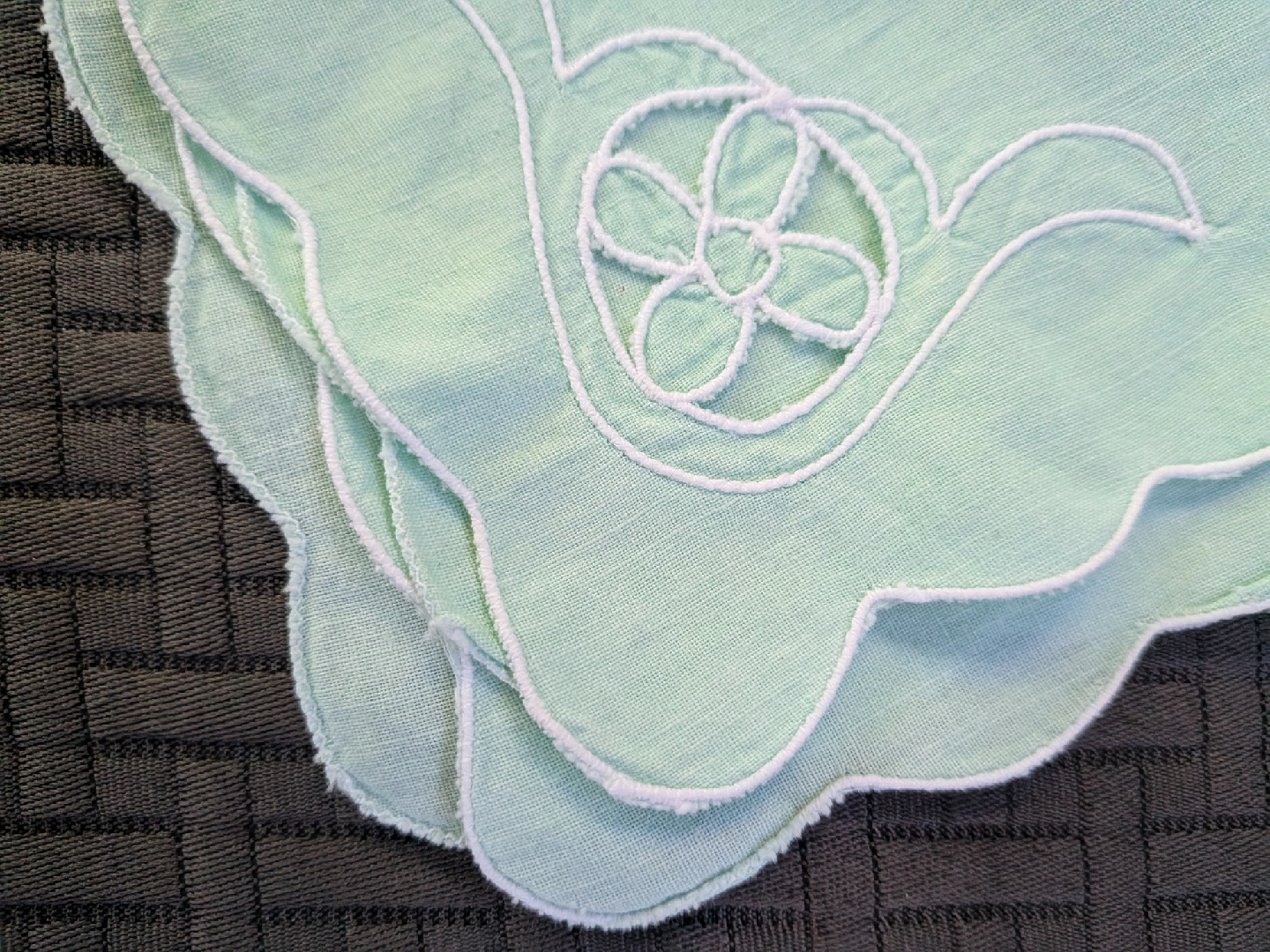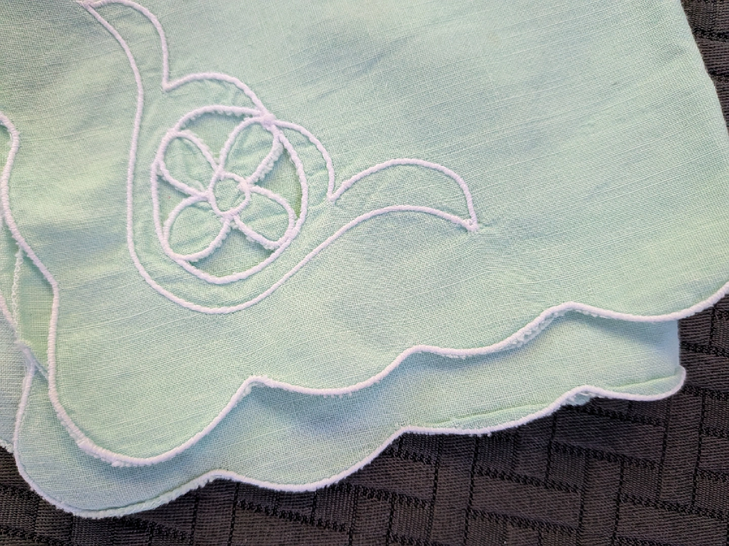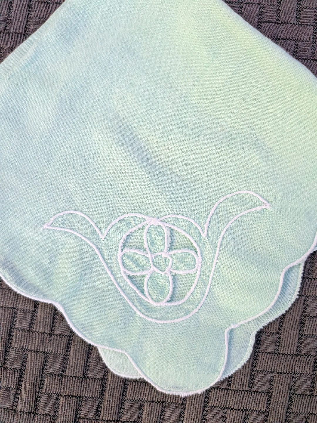 Here's a sweet vintage light blue handkerchief with delicate embroidery. It has a scalloped edge and is in great shape. Perfect for adding a touch of charm to your everyday carry or for a special occasion From the 50's era Not new, but good condition despite its age, with no stains, tears, etc Cash only, no etransfers Location: Etobicoke. Rathburn Rd and Renforth dr. Etobicoke Olympium nearby