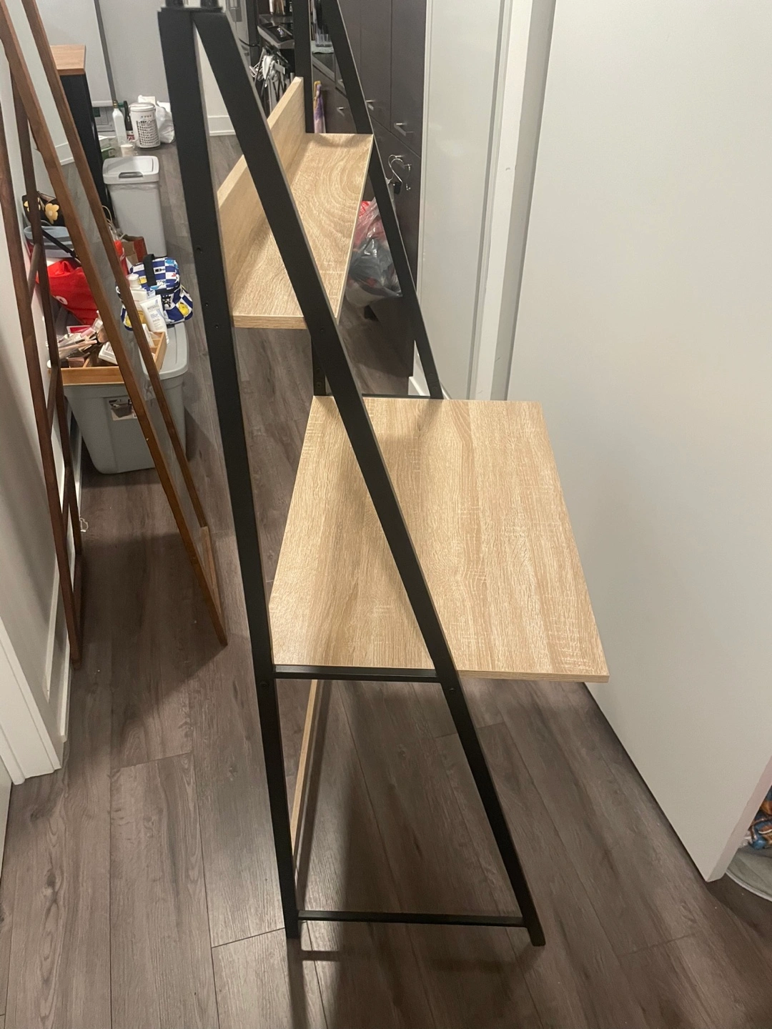 Here's a stylish ladder shelf with a blond wood finish and black metal frame! It's perfect for adding a modern touch to any room. Great for displaying plants, books, or other decorative items. It's in great condition and ready for a new home.