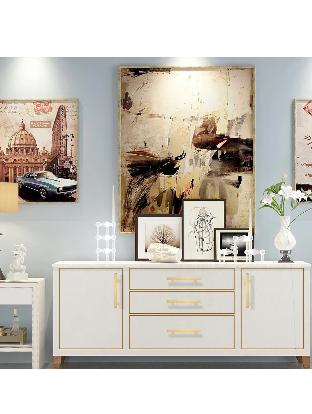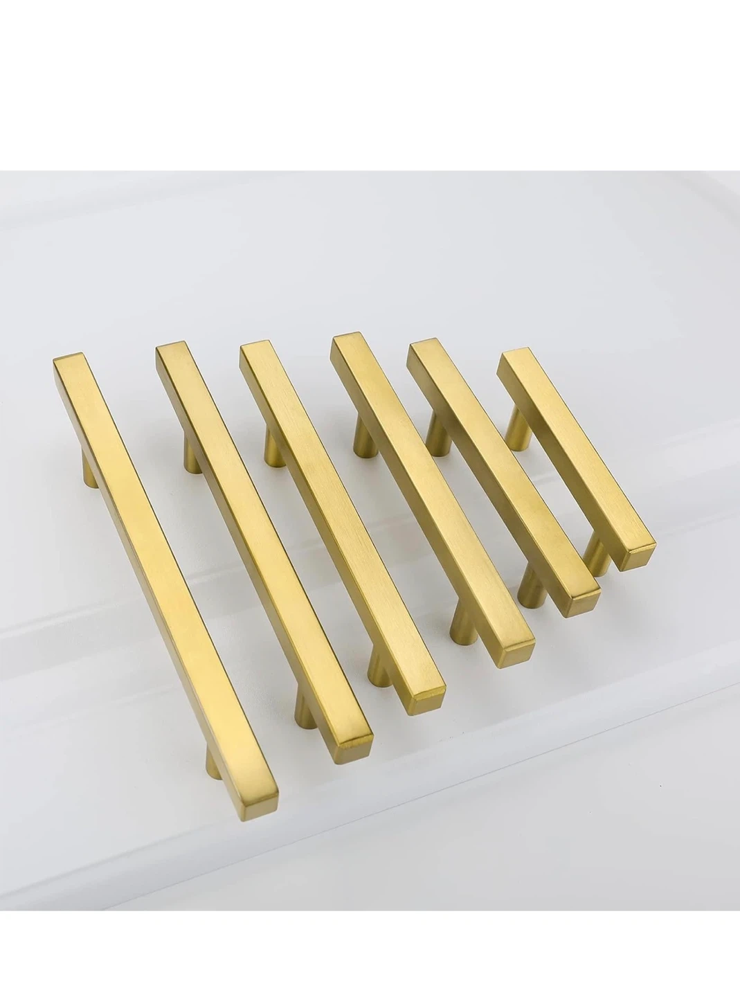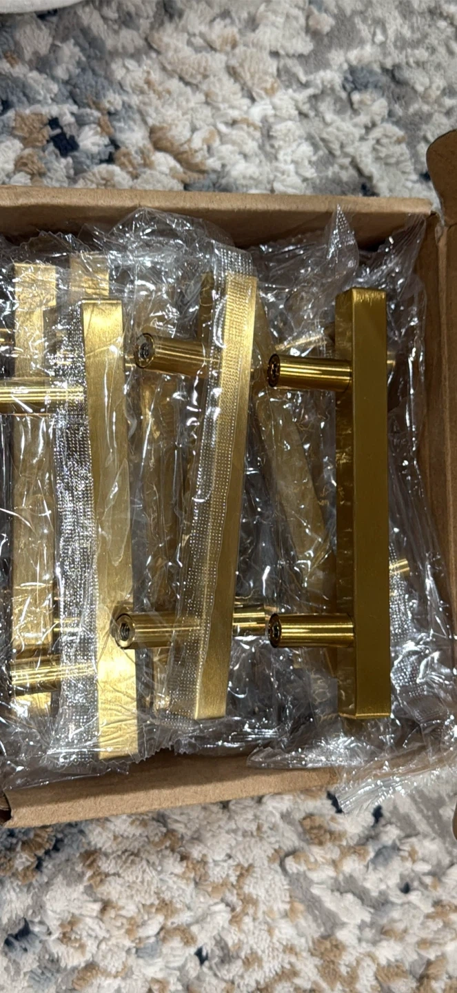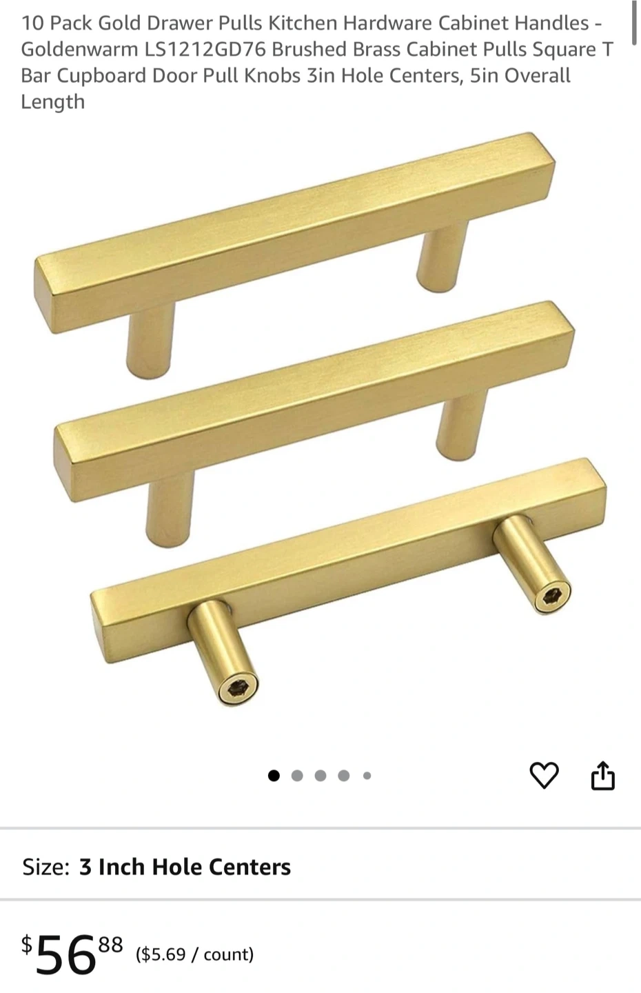 These gold drawer pulls are in great condition! They have a 3 inch hole center and an overall length of 5 inches. They are made of brushed brass and are strong and wear-resistant. Originally bought for $56.88