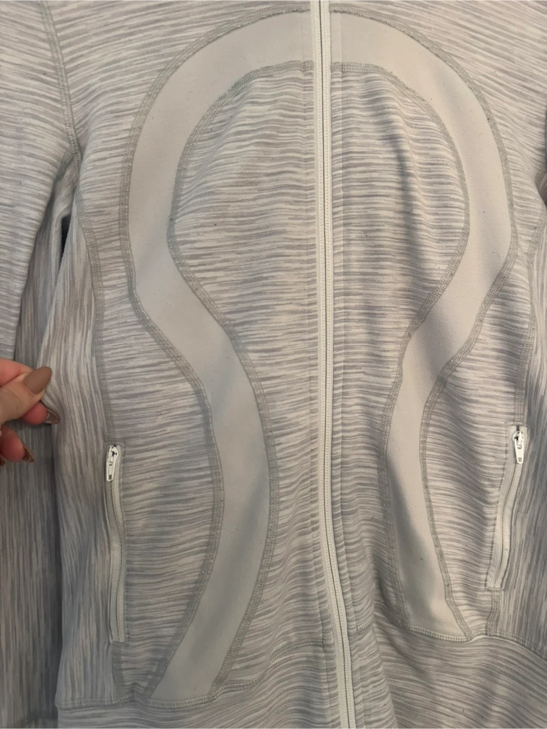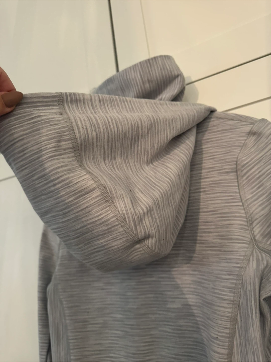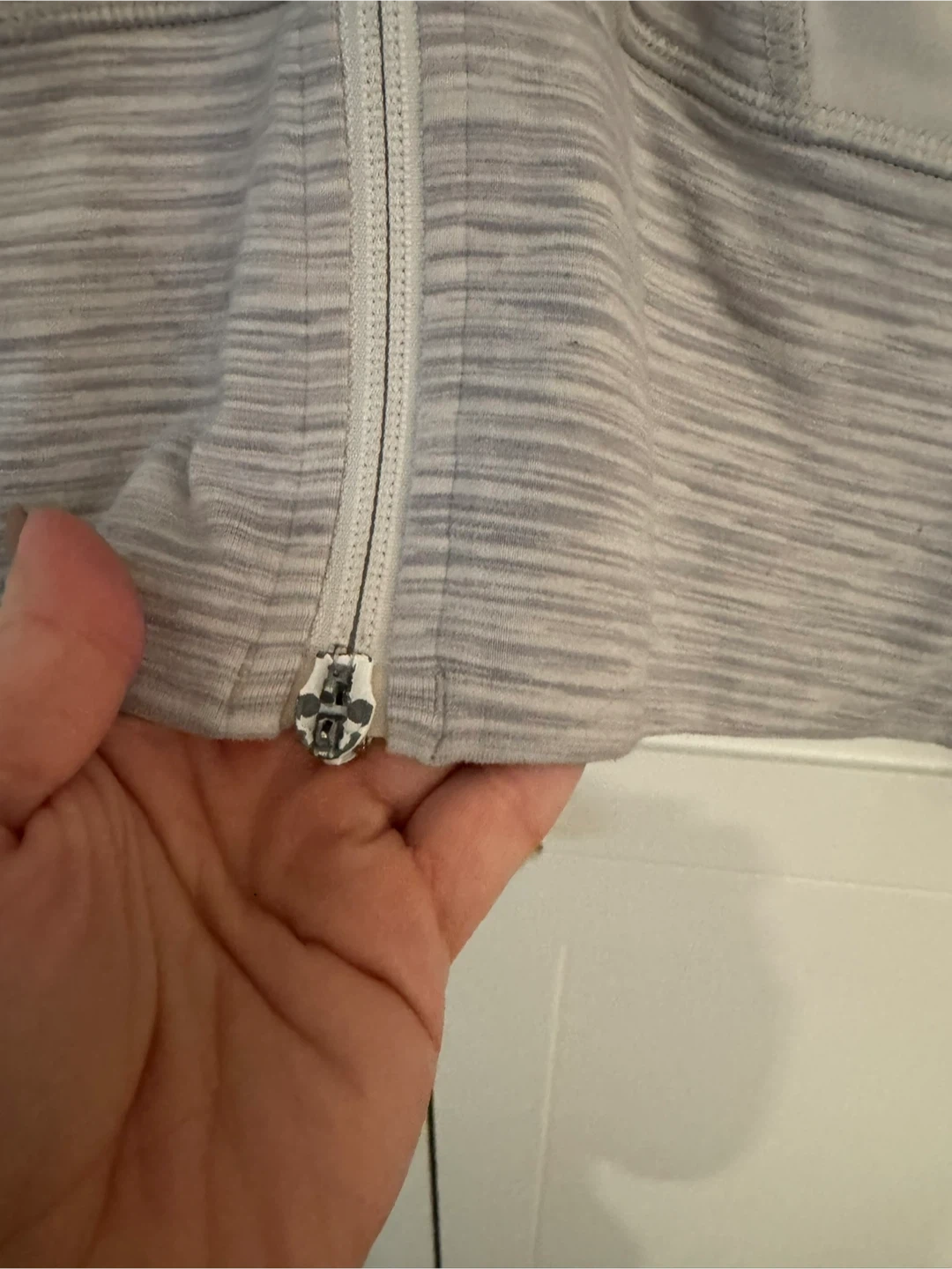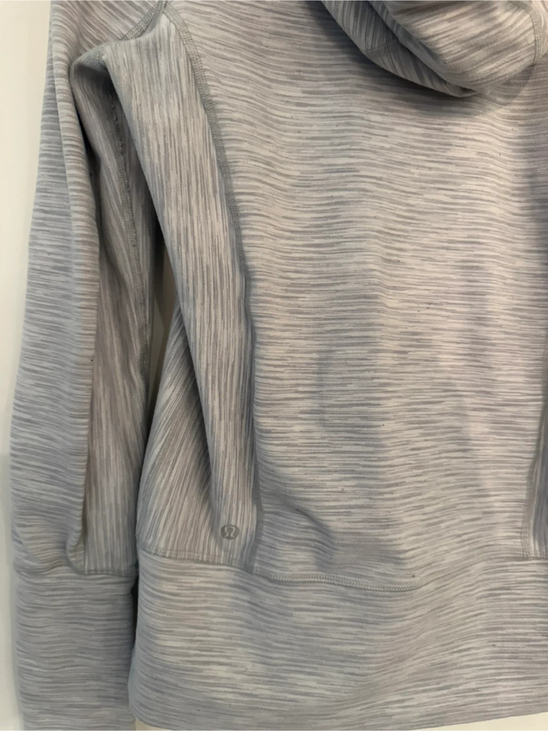 Grey & White Lululemon Hooded Zip-Up Size 4 The bottom zipper is broken (refer to photos) The string is missing (refer to photos) Pre-Loved lived in condition.