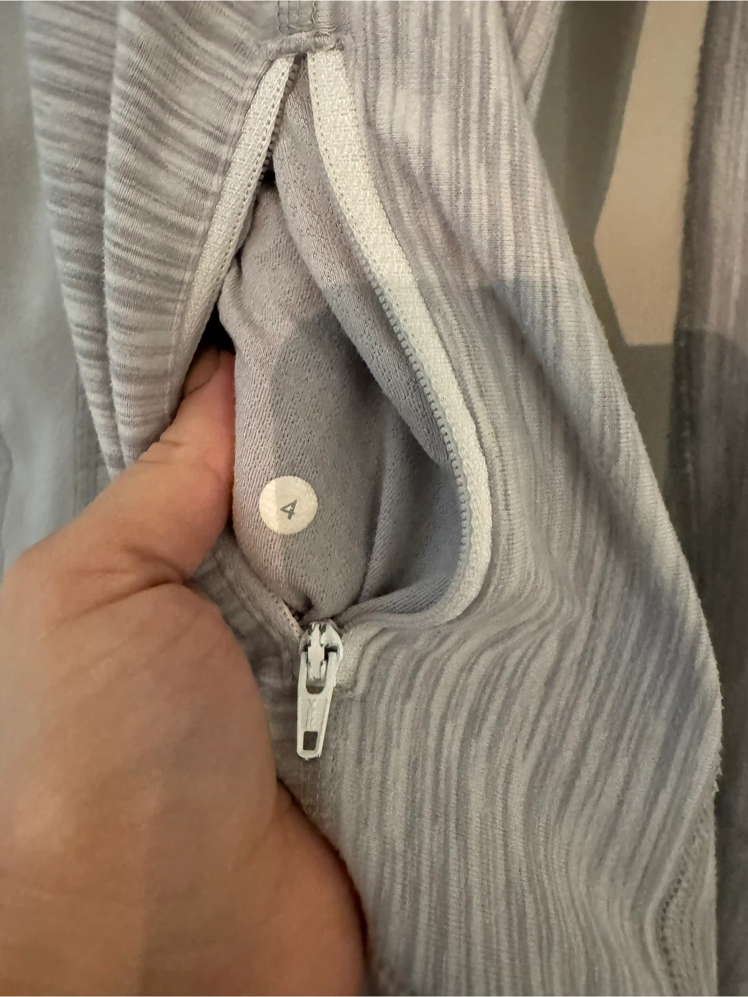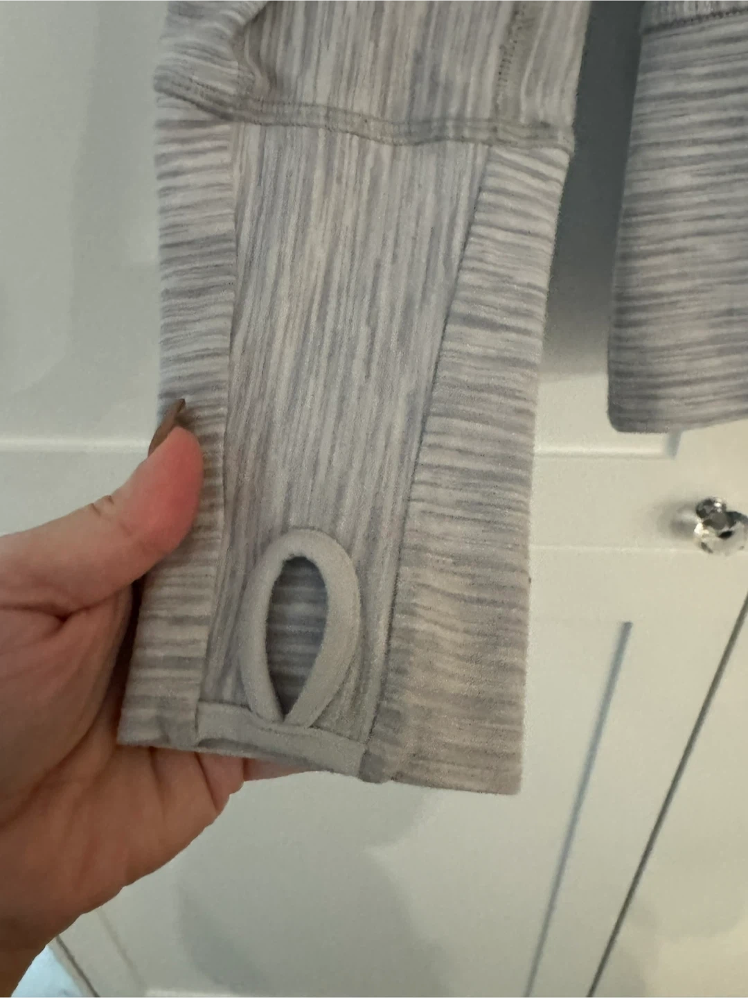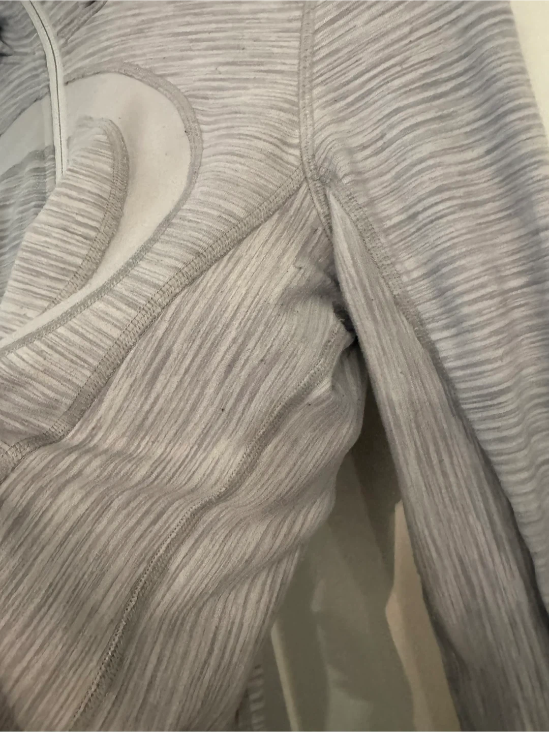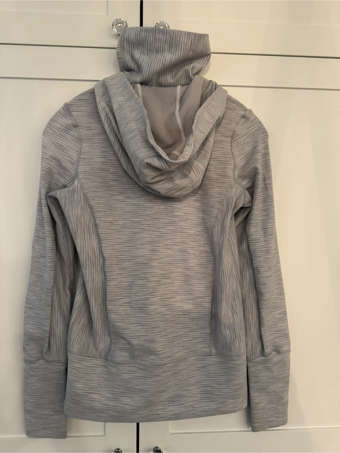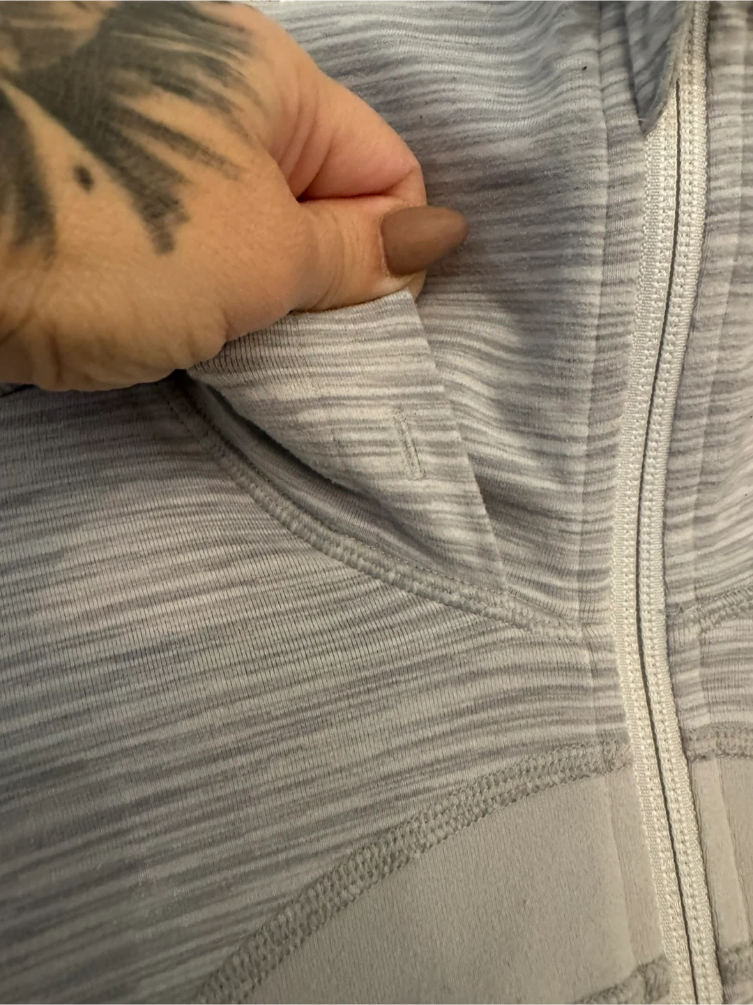 Grey & White Lululemon Hooded Zip-Up Size 4 The bottom zipper is broken (refer to photos) The string is missing (refer to photos) Pre-Loved lived in condition.