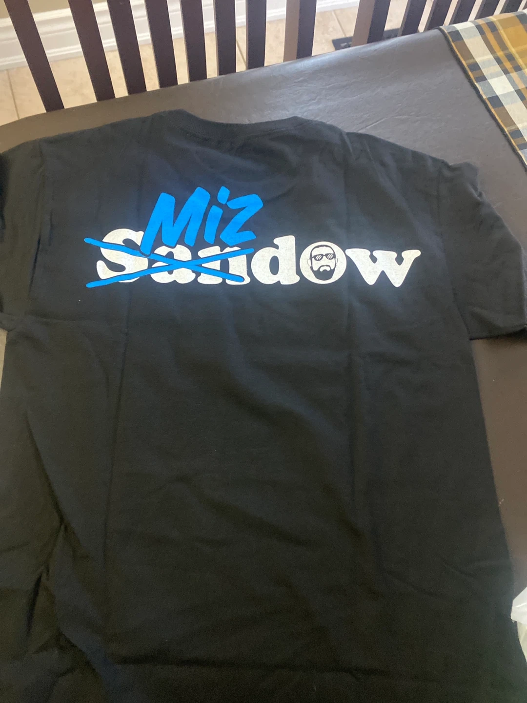 Selling a WWE youth size medium t-shirt. It's black and features the words "Stunt Double" on the front and "Miz Sandow" on the back. The tag indicates it's made of 100% cotton