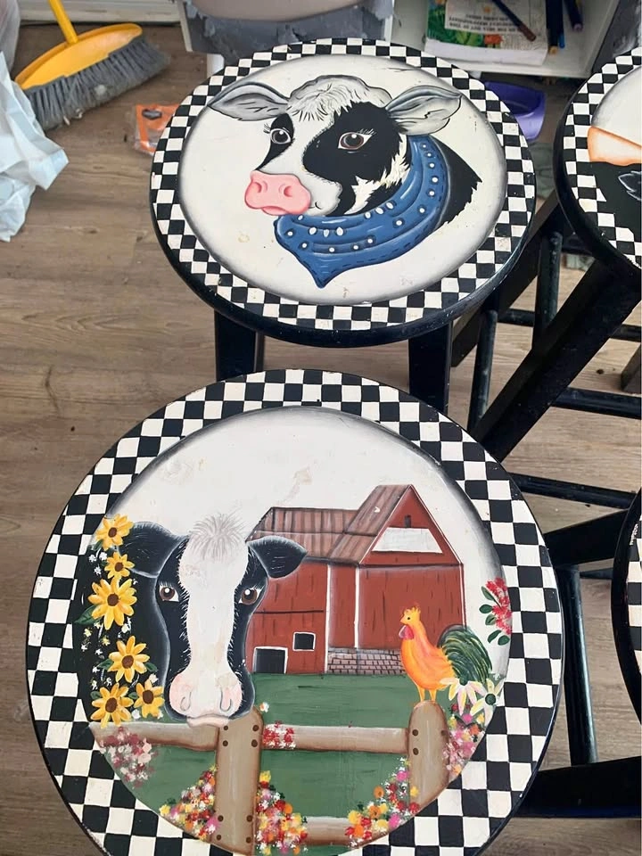Hand-painted wooden stools with fun cow artwork 🐄. Sturdy, unique, and perfect for farmhouse, rustic, or country-style décor. Set of 4. Asking $50 for all (or $15 each) — open to offers for quick pickup. Pickup only