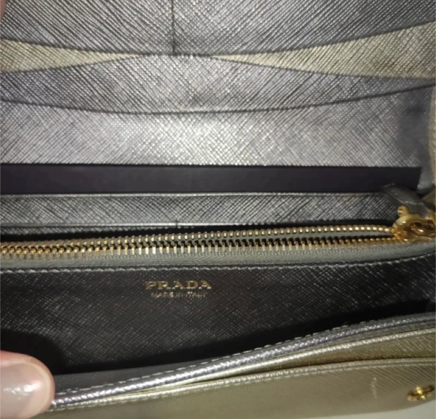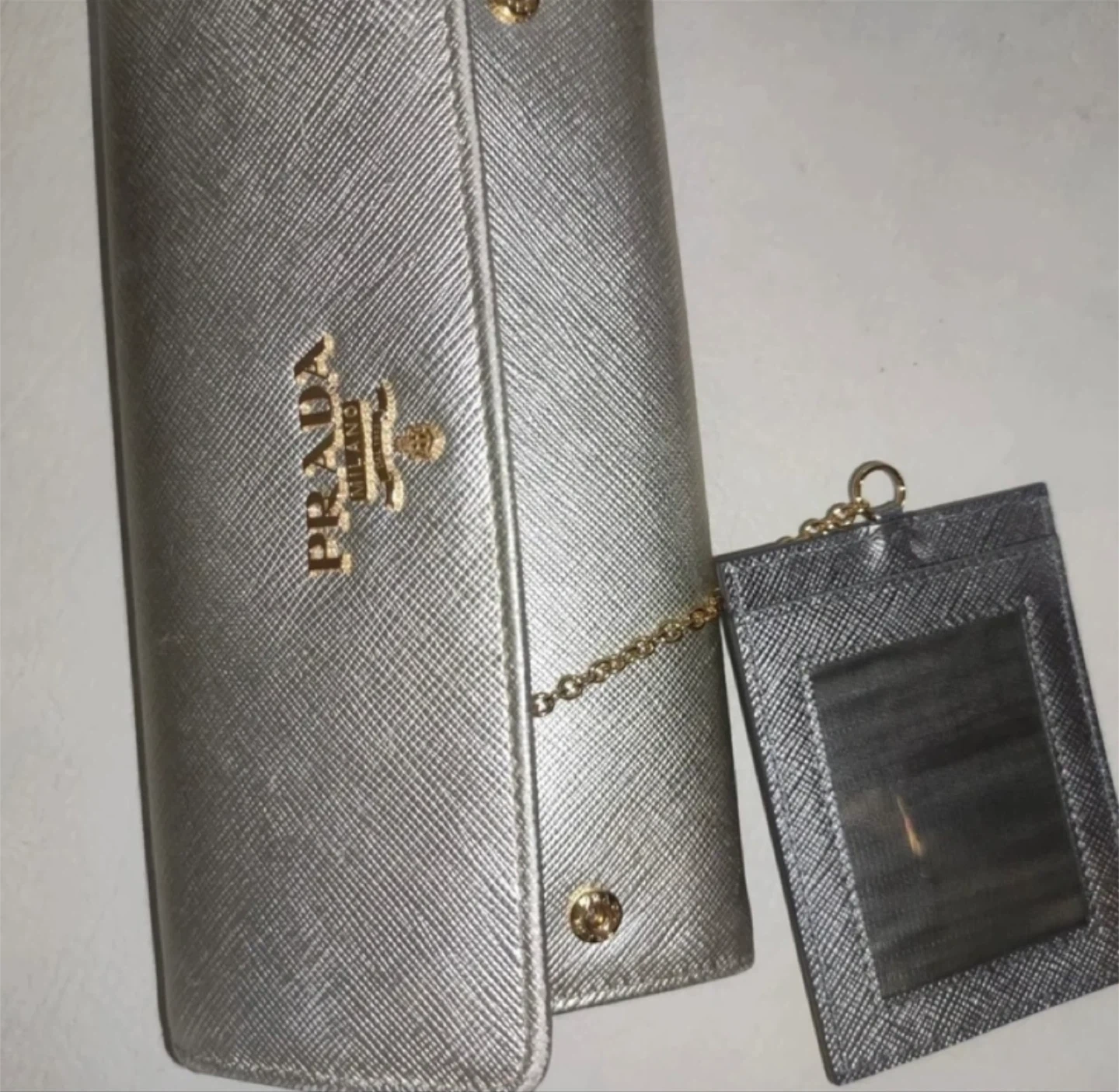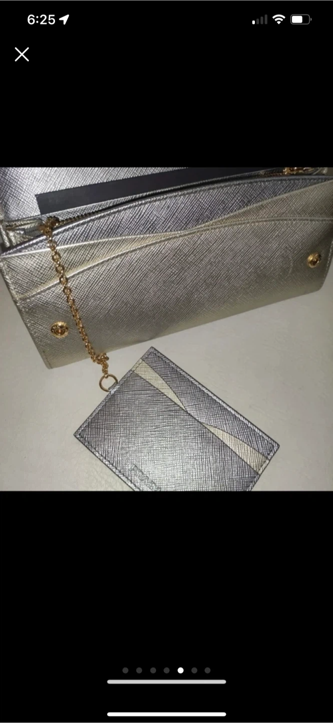 Selling a beautiful Prada wallet in gold! It comes with its original box and authenticity cards. This wallet has lots of space for cards and cash. It's in great condition and ready for a new home.
