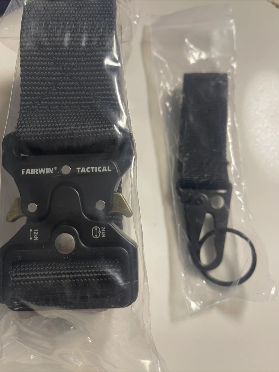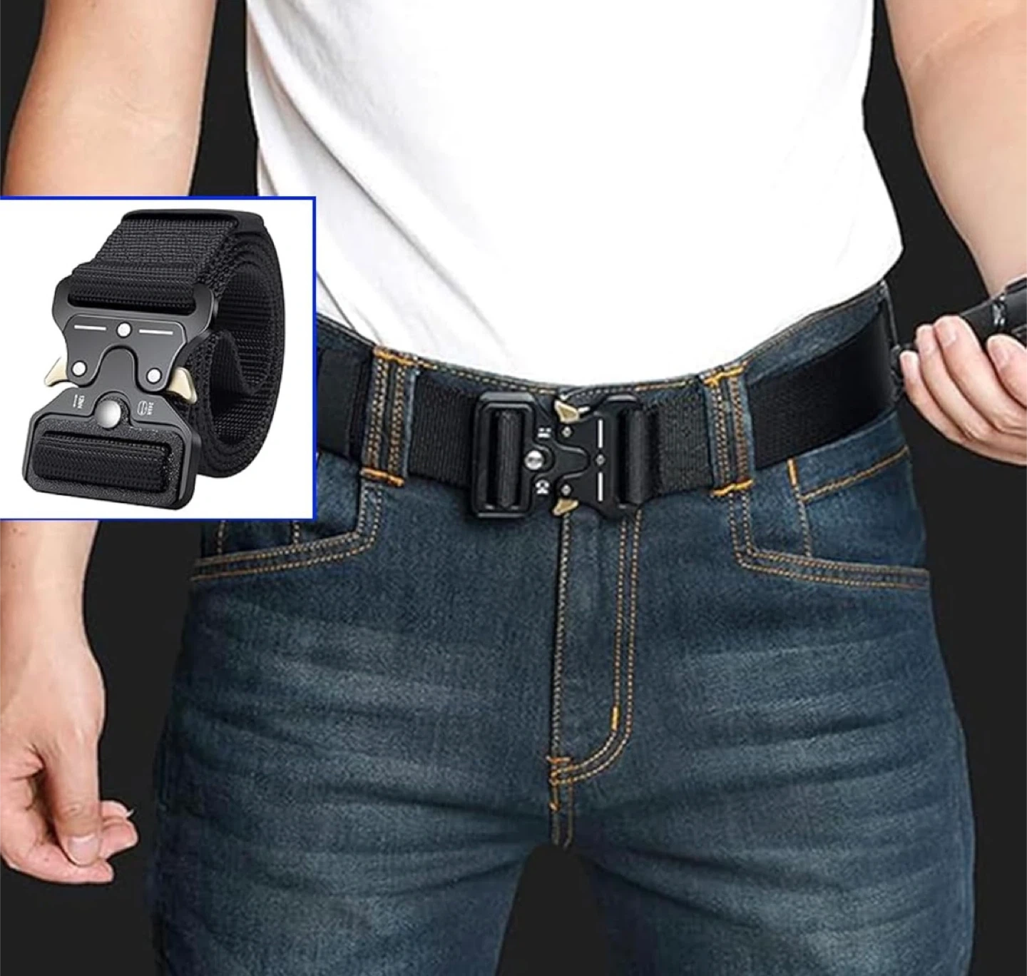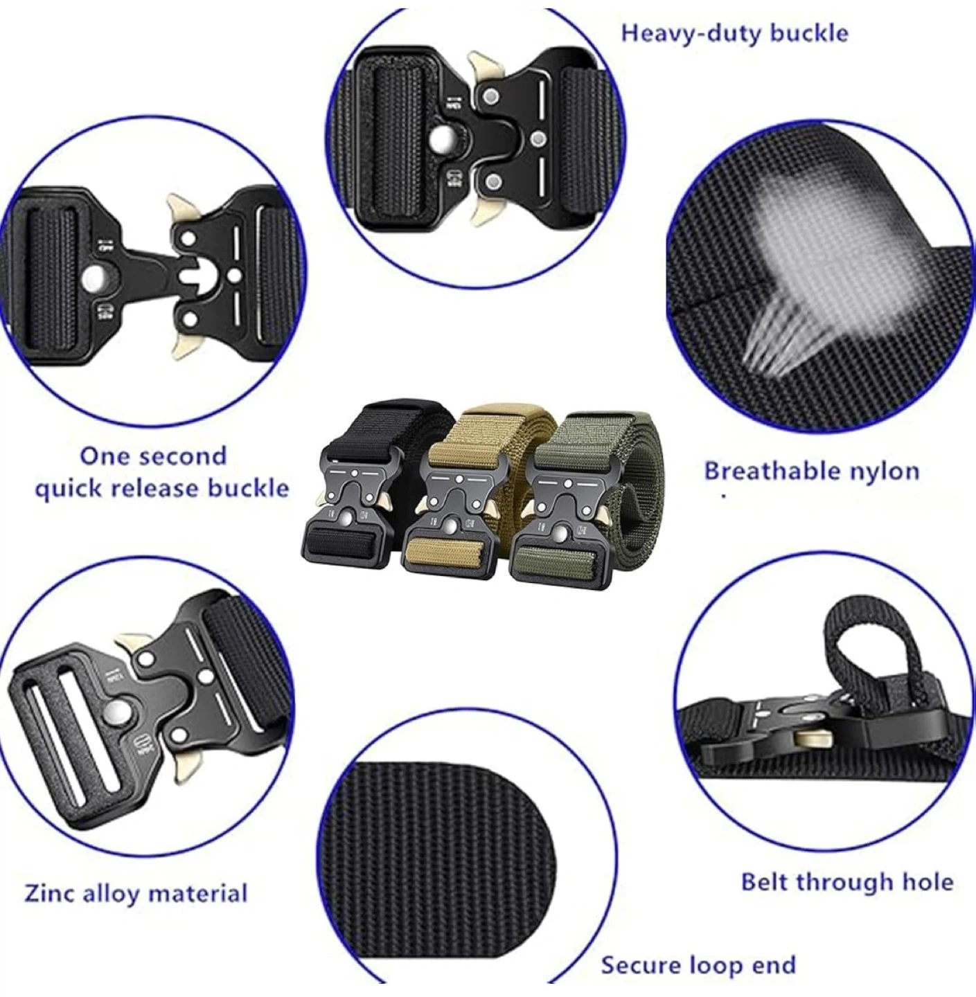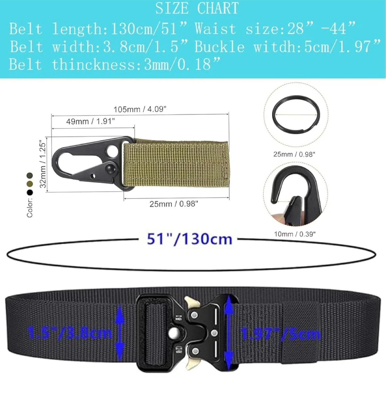 Selling a tactical belt made of heavy-duty nylon. Key features: - Belt length: 51 inch / 130cm - Waist size: 28" - 44" - Belt width: 1.5" / 3.8cm - Buckle width: 1.97" / 5cm - Belt thickness: 0.18" / 3mm It features a heavy-duty buckle and breathable nylon construction. The buckle offers a one-second quick release. Made with zinc alloy material and a secure loop end