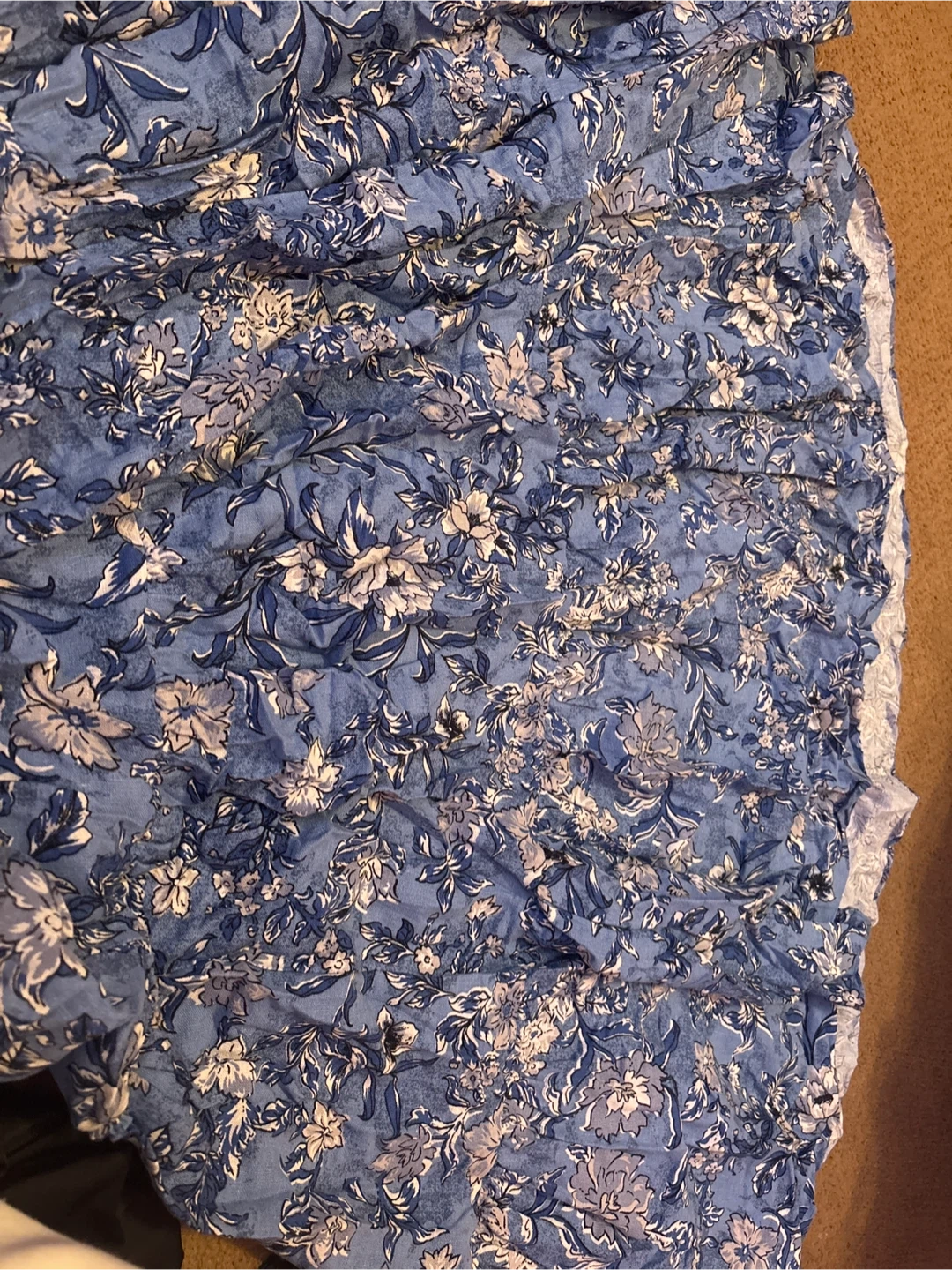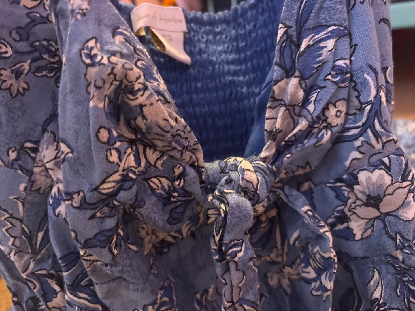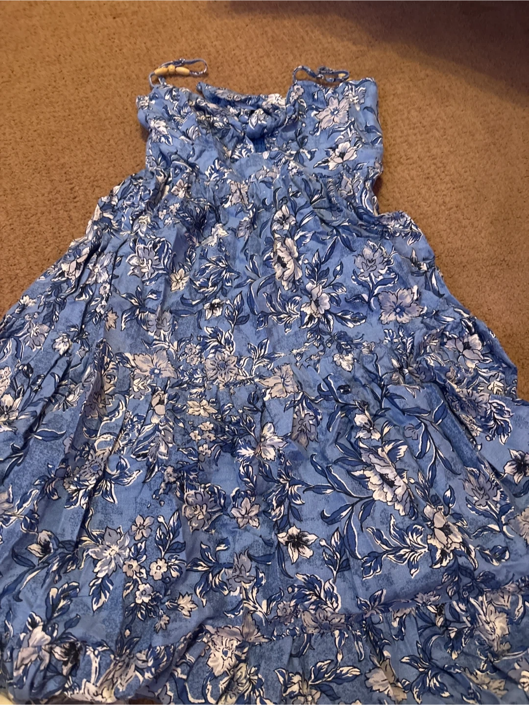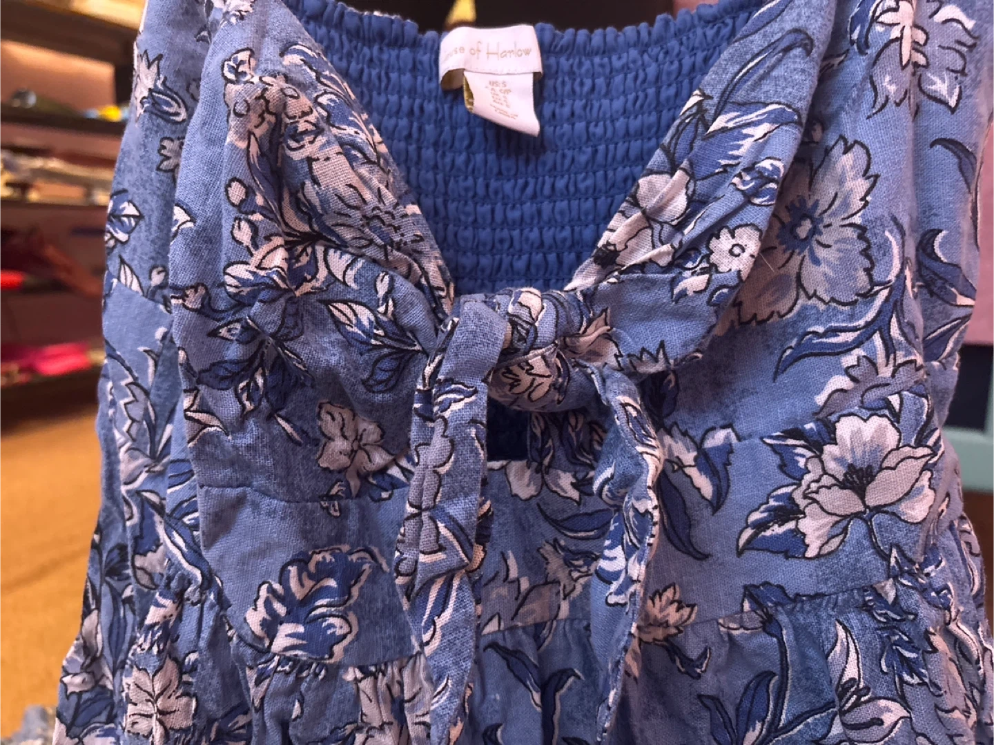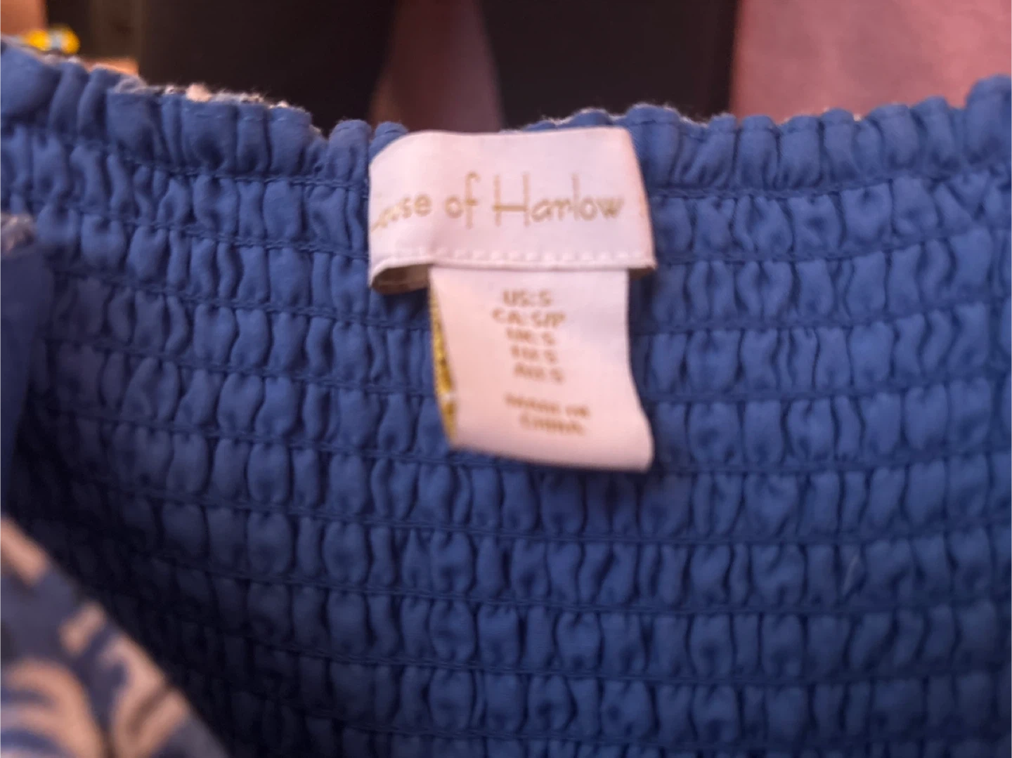 This is a cute House of Harlow dress! It's a size small and features a beautiful blue floral pattern. Perfect for a summer day or a casual outing