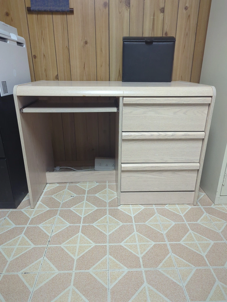 Selling a wooden desk that's perfect for a home office or study space! It features a pull-out keyboard tray and three drawers for storage. The desk is in good condition and ready for a new home