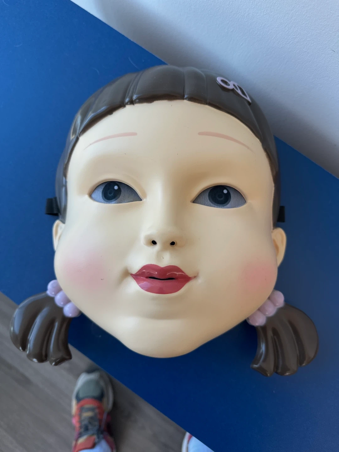 Selling a Squid Game doll mask! It's in great condition and ready for Halloween or costume parties. The mask features the iconic doll face from the show with its recognizable pigtails and expression. Perfect for fans of the series!