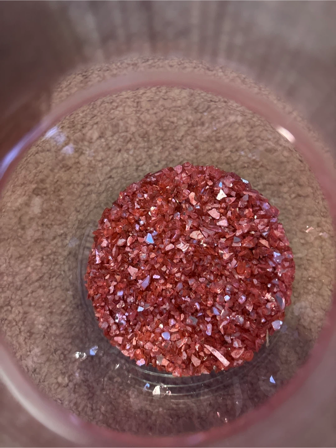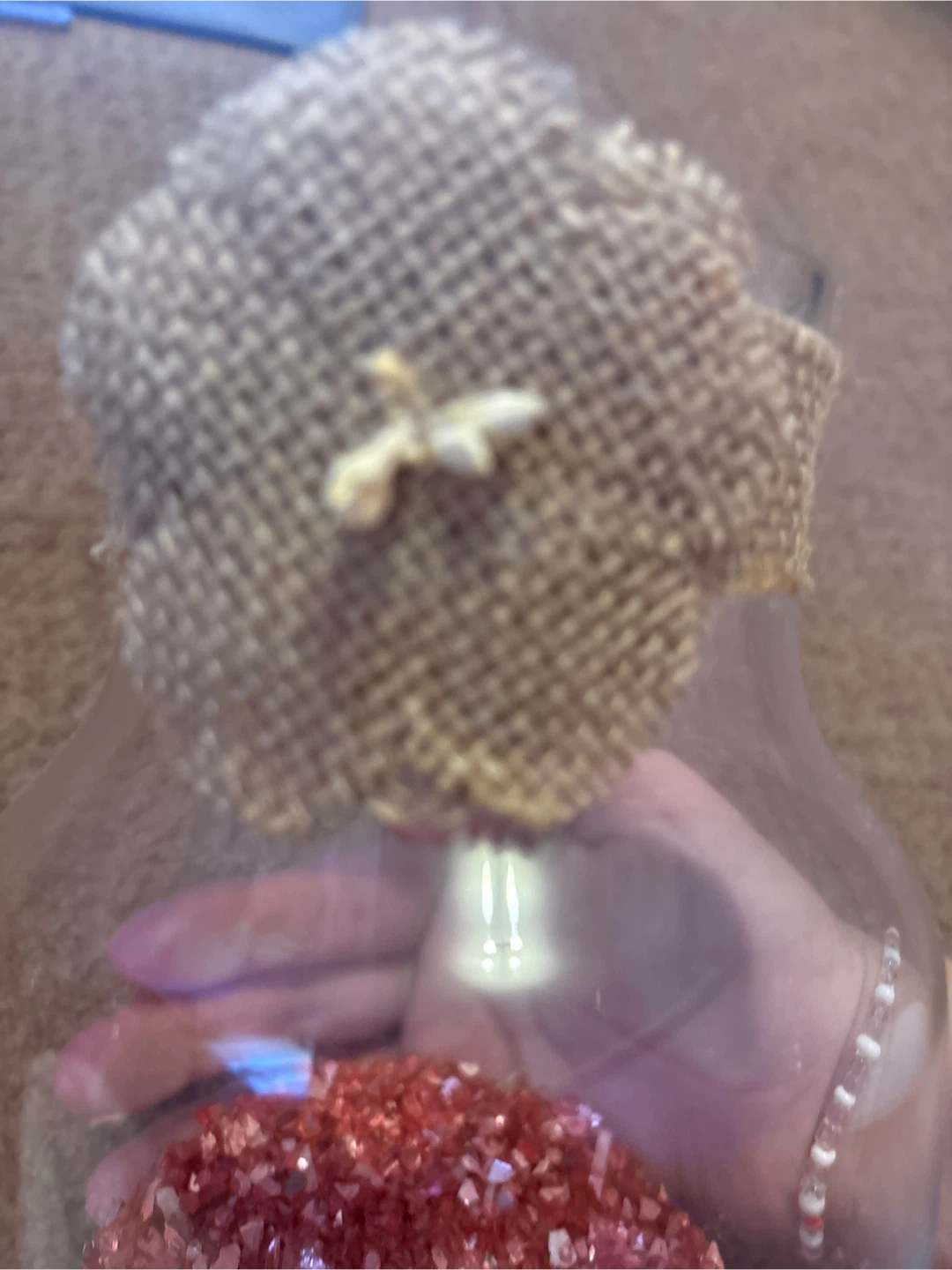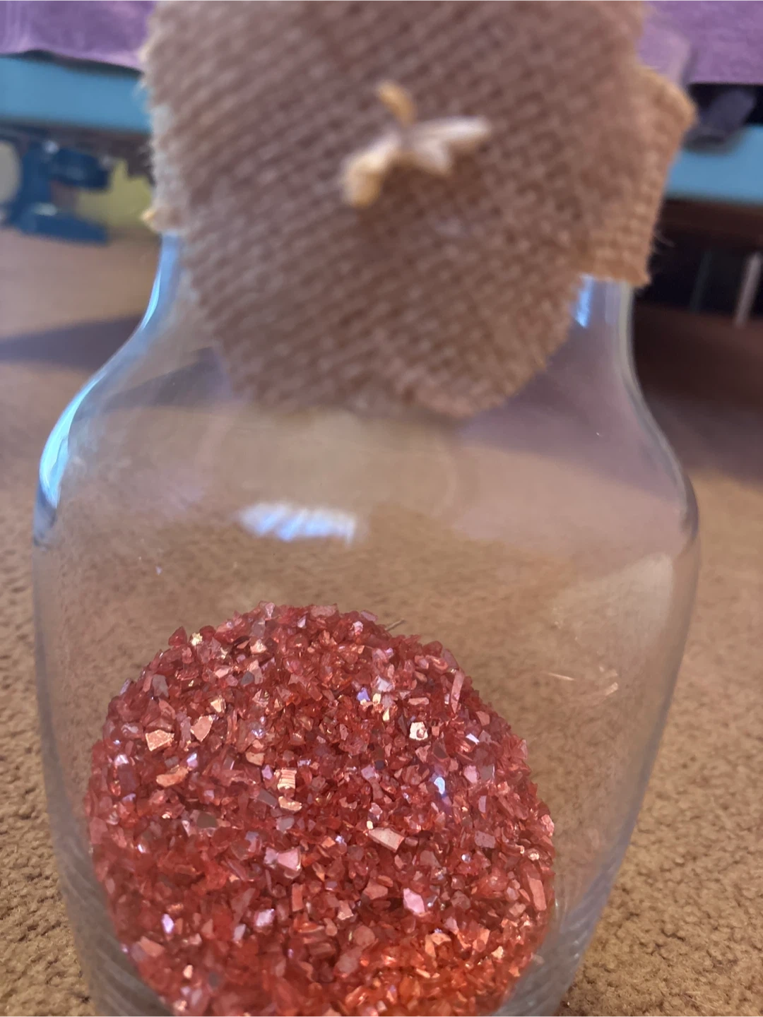 I'm selling a jar filled with decorative red crystals. It's a unique piece that would add a touch of sparkle to any space. The jar is glass and has a rustic burlap covering on top. Perfect for adding a pop of colour to your home decor!