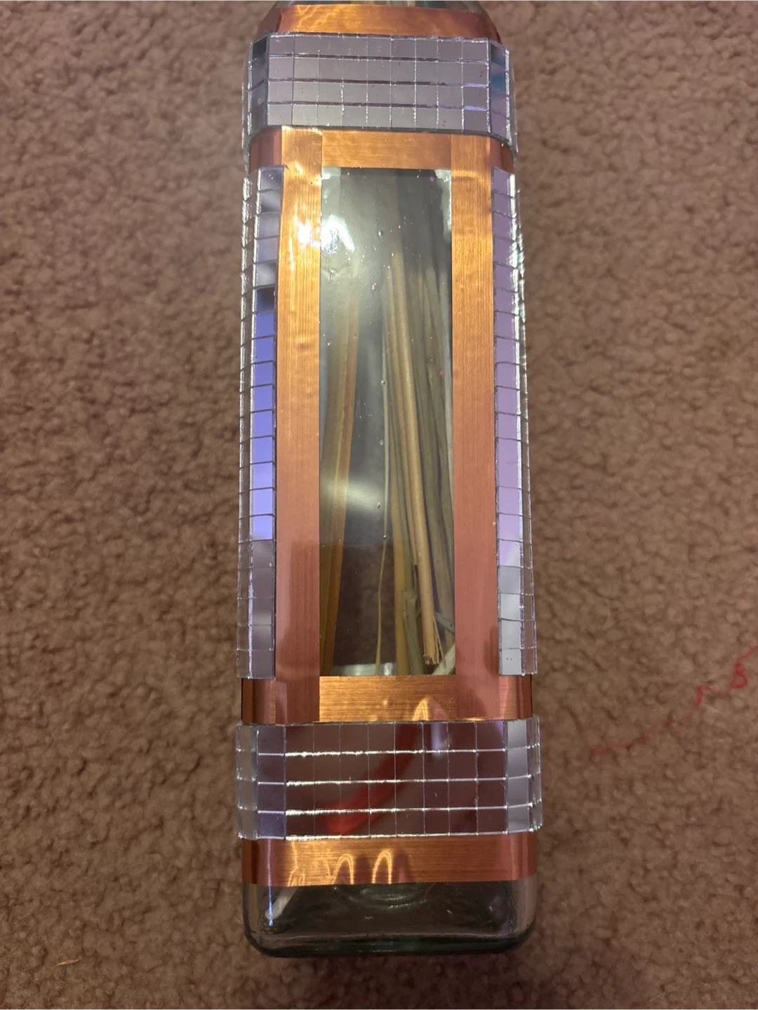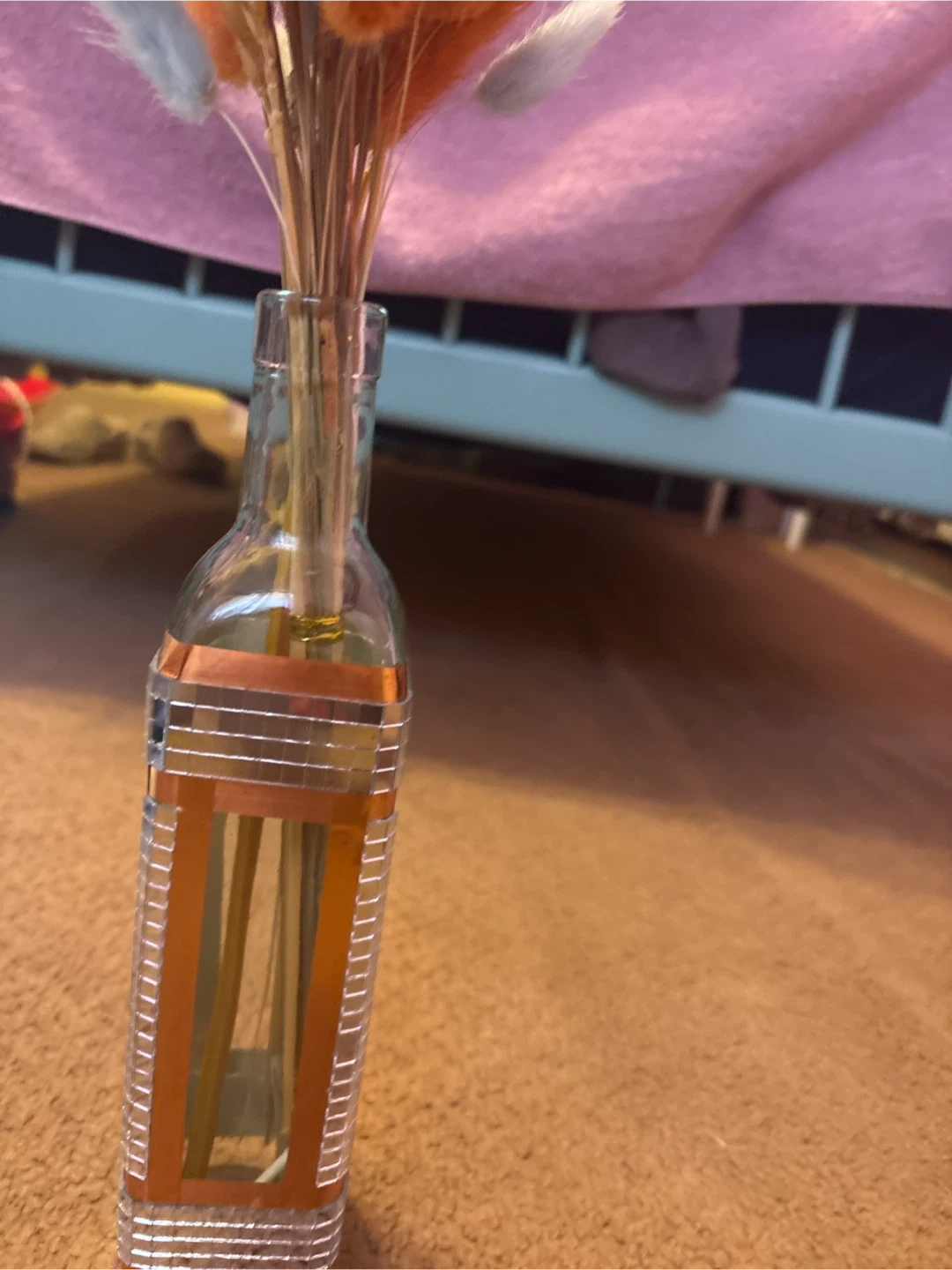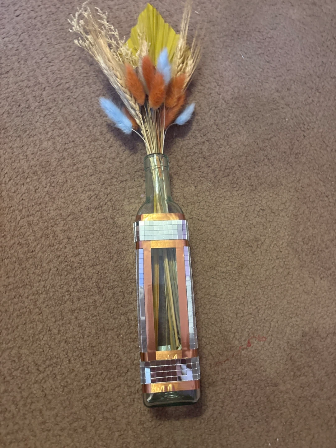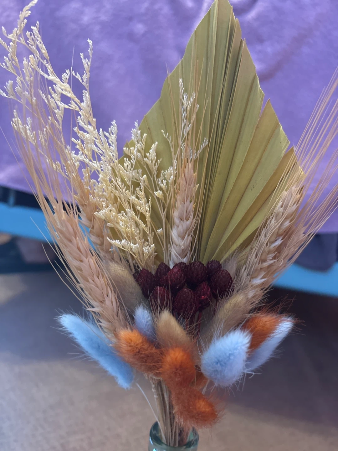 This is a decorative dried flower arrangement in a glass bottle. It would look great in any room!