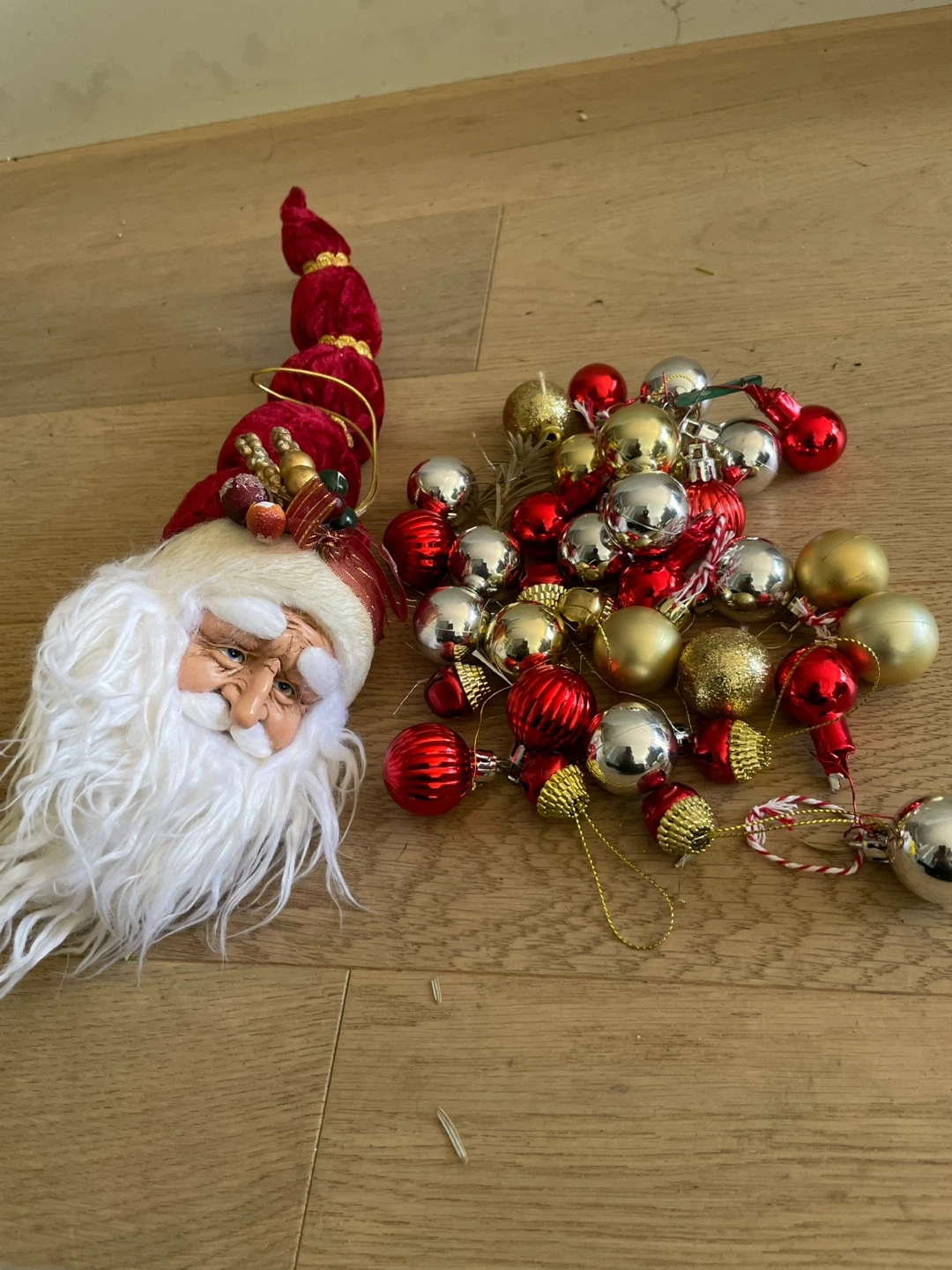 Selling a Christmas Santa decoration with a bunch of red, gold, and silver ornaments. It's perfect for adding some festive cheer to your home this holiday season All for 10$ Cash only