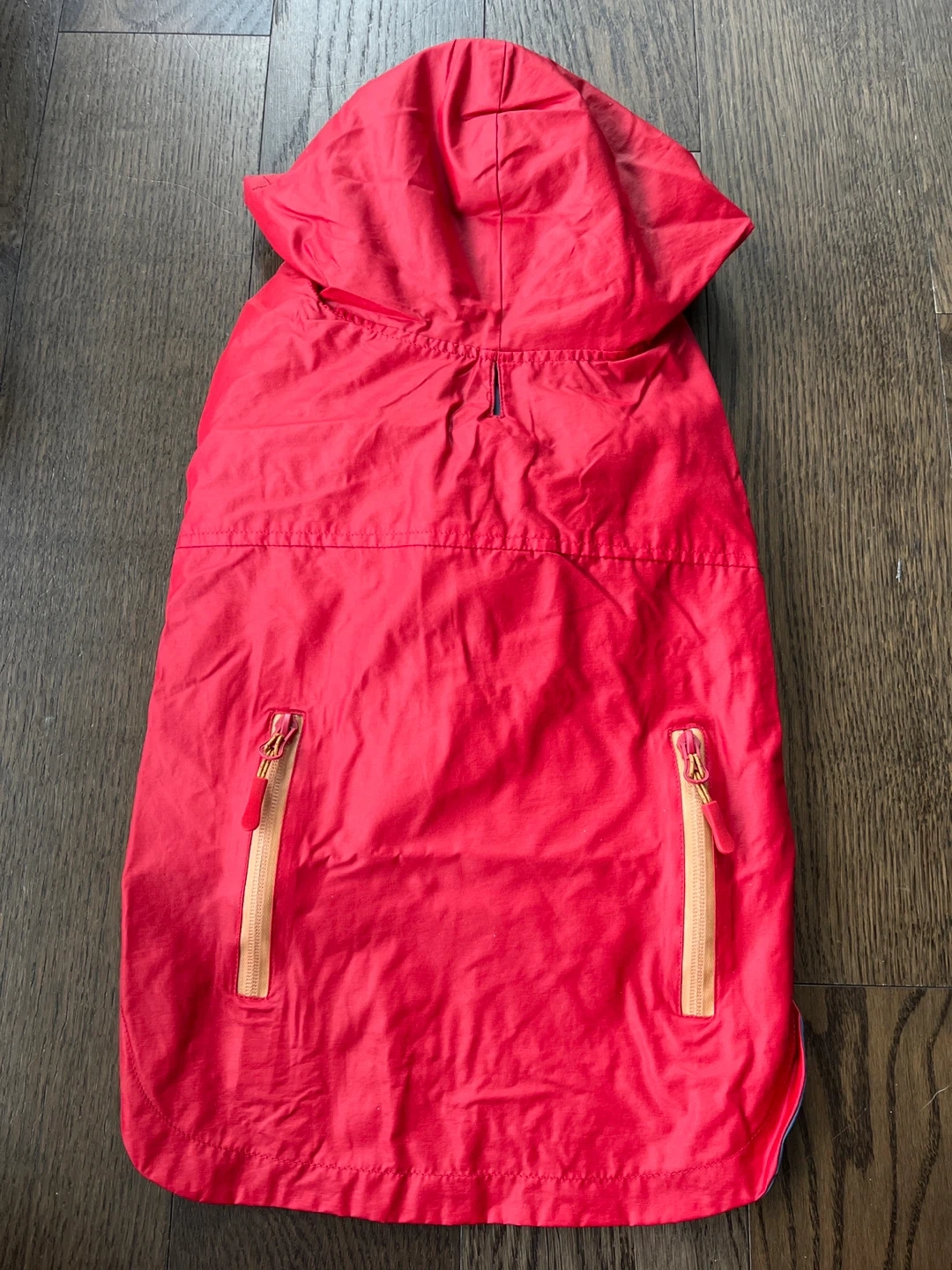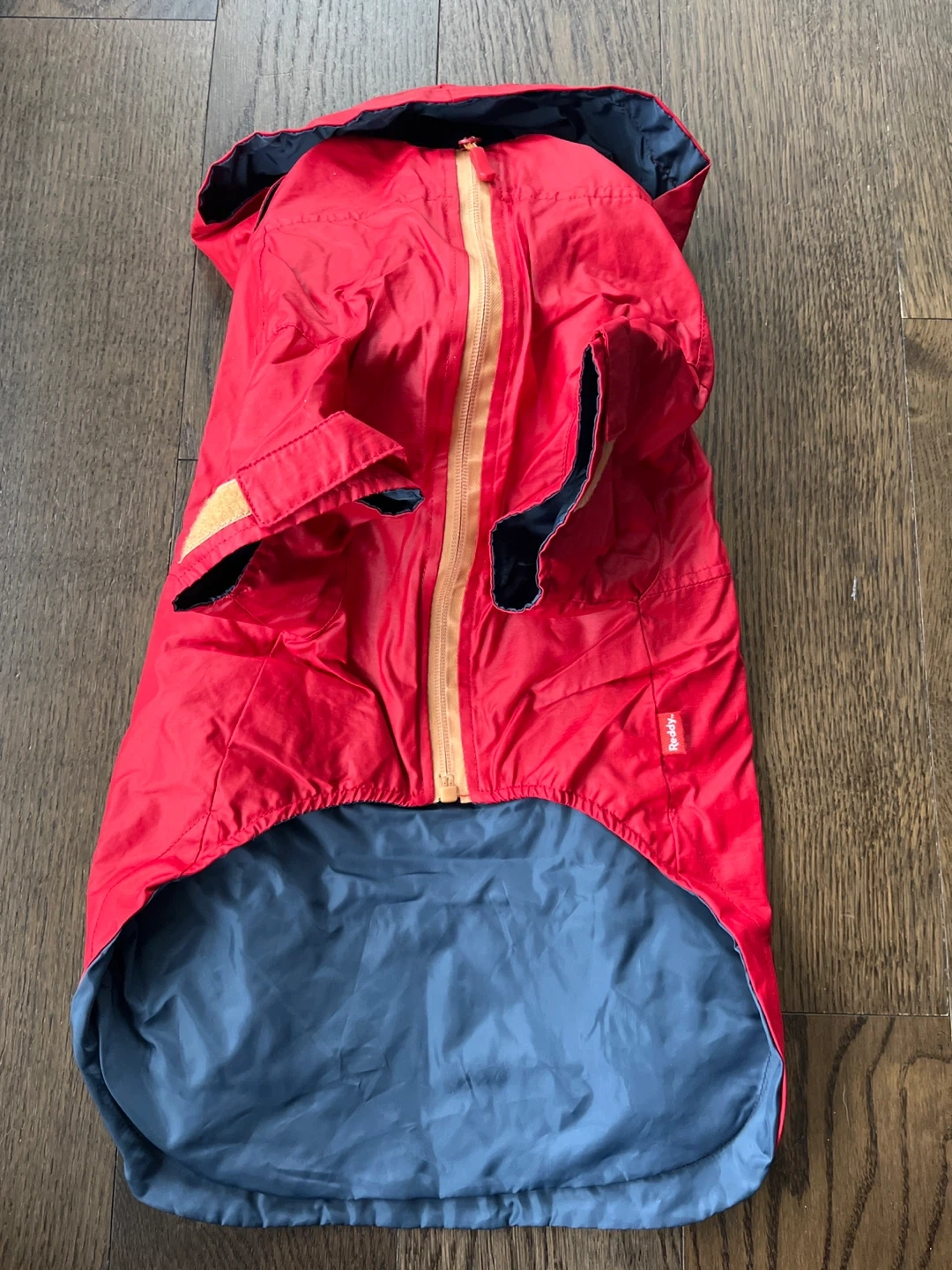 Selling a red Reddy dog raincoat! It has a hood and a zipper. Great for keeping your furry friend dry on those rainy days! Length from neck: 15.5 inches Circumference: 23 inches