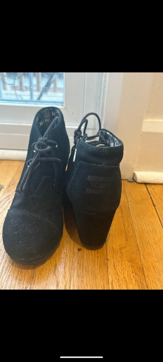 Selling a pair of TOMS black suede wedge ankle boots in size 7. They're in good condition and ready for a new home! Perfect for adding a bit of height and style to your outfit
