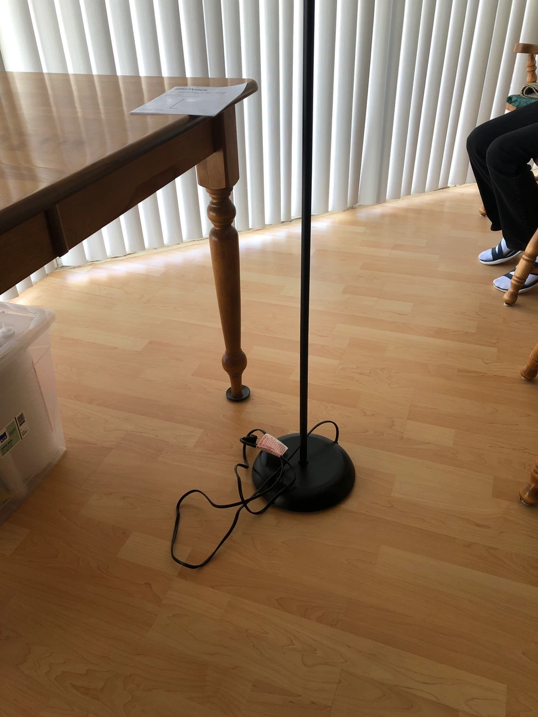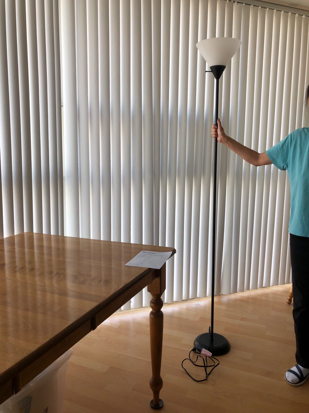 Selling a floor lamp with a sleek black stem and a classic white shade. It's in great shape and ready to brighten up your space. The base is a sturdy black, ensuring it stands tall and steady. Perfect for living rooms, bedrooms, or any corner that needs a little extra light