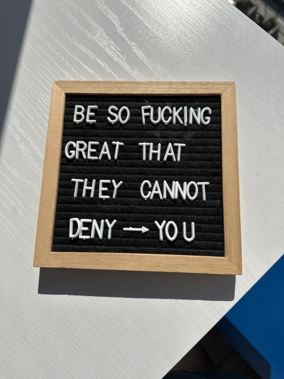 A letter board with a wooden frame and a motivational message. Perfect for adding a bit of inspiration to your space!