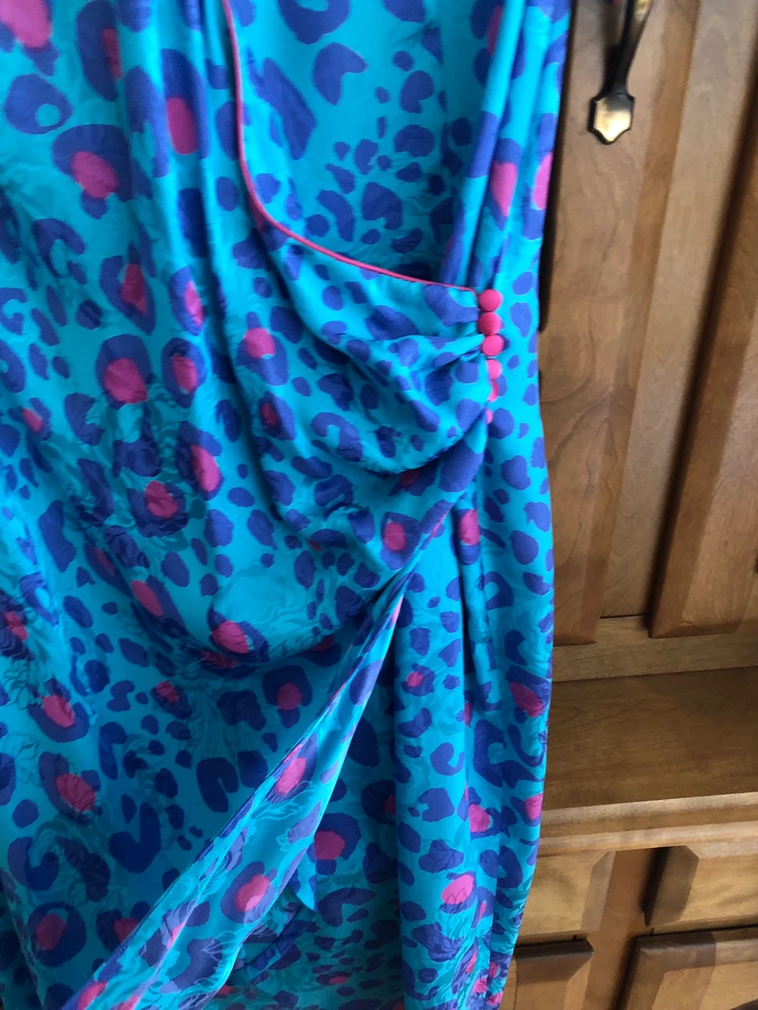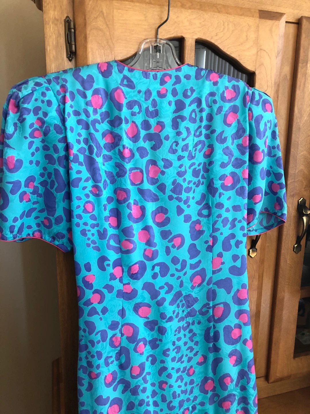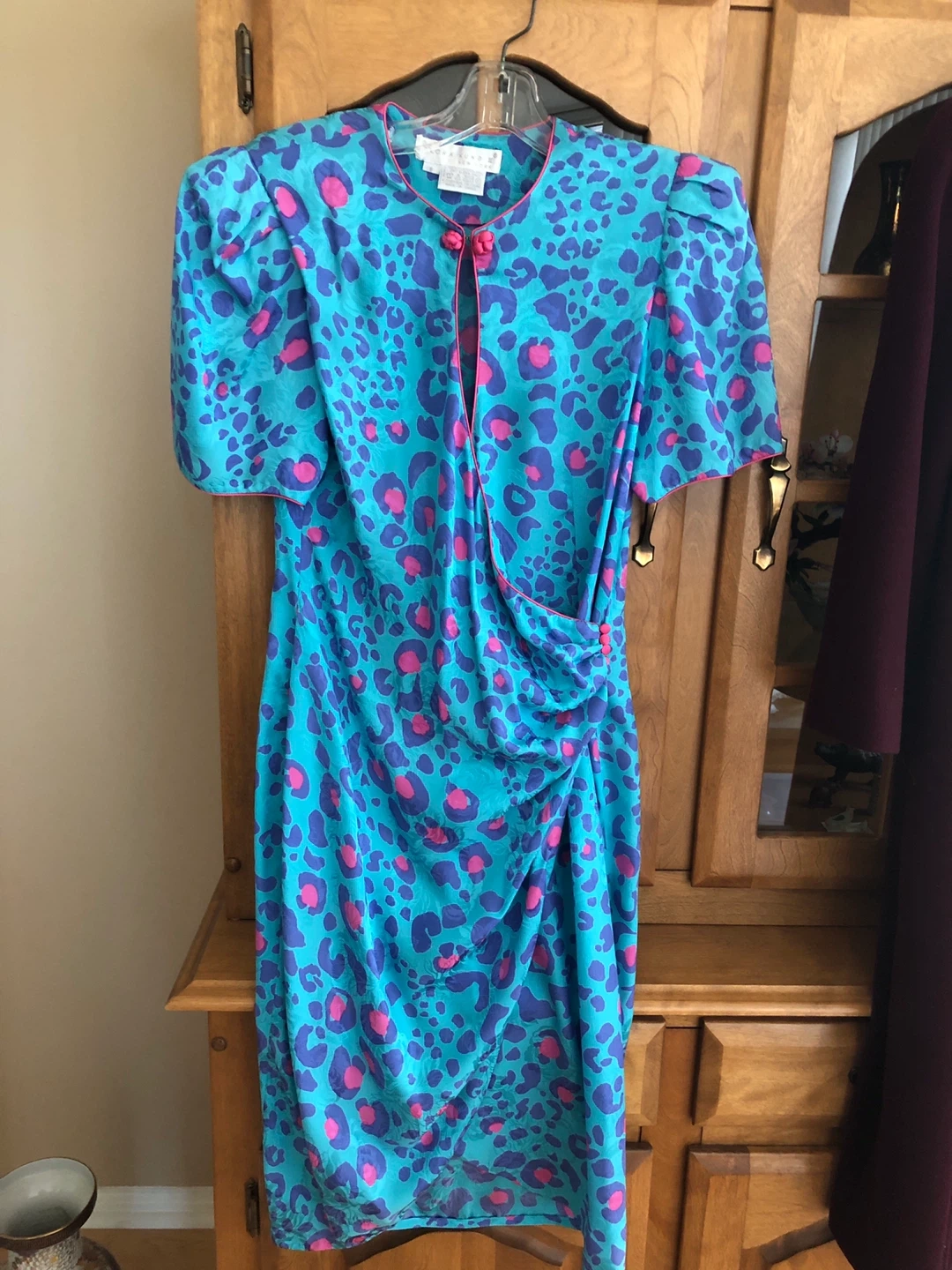 Vintage - Beautiful Flora Kung II dress in size 6! It's made of 100% silk with a fun and vibrant blue and pink leopard print pattern. Perfect for a night out or a special occasion